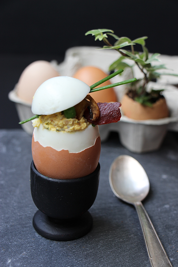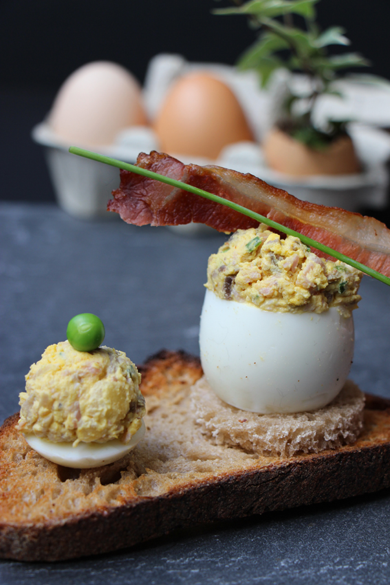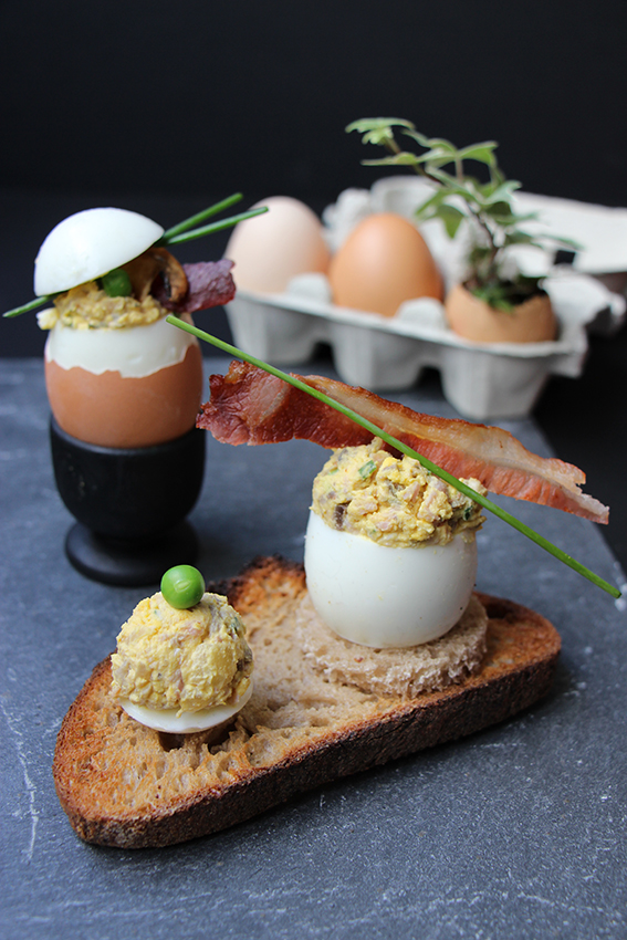 Écaler les oeufs, complètement ou juste à moitié. Découpez le chapeau et à l’aide d’un couteau à bout arrondi, videz délicatement les jaunes durs que vous ajouterez à la farce. Mélangez la farce et les jaunes. Rectifiez l’assaisonnement si nécessaire. Il ne reste plus qu’à remplir les oeufs à l’aide d’une petite cuillère à café en donnant au chapeau un aspect bombé. Réservez au frais jusqu’au moment de servir dans des coquetiers ou sur une belle tranche de pain de campagne toastée dans laquelle, à l’aide d’un petit emporte-pièce ou d’un bouchon en plastique, vous aurez fait un trou pour que l’oeuf tienne. Vous pouvez, si vous le souhaitez, faire griller votre 2 eme tranche de lard découpée en fines lamelles, dans une poêle anti-adhésive (sans ajouter de graisse), et la disposer sur votre oeuf avec un brin de ciboulette.