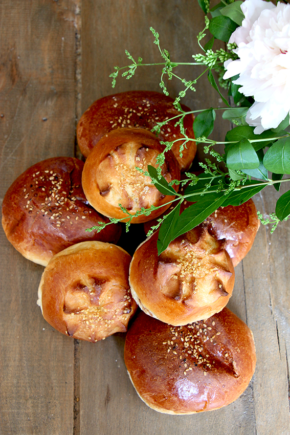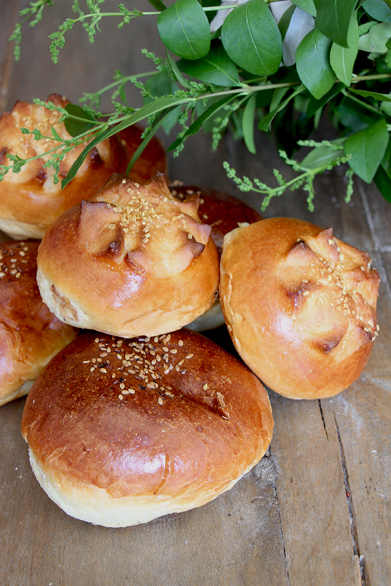 Dorez à l’oeuf battu (1ère dorure). Laissez-les pousser encore pendant 1h environ. Lorsque les petits pains ont poussé, dorez-les de nouveau (2ème dorure). Coupez le haut de petits pains avec des ciseaux (sauf pour les pains à burger), puis parsemez de sucre en grains, de graines de sésame, de pavot ou autres.