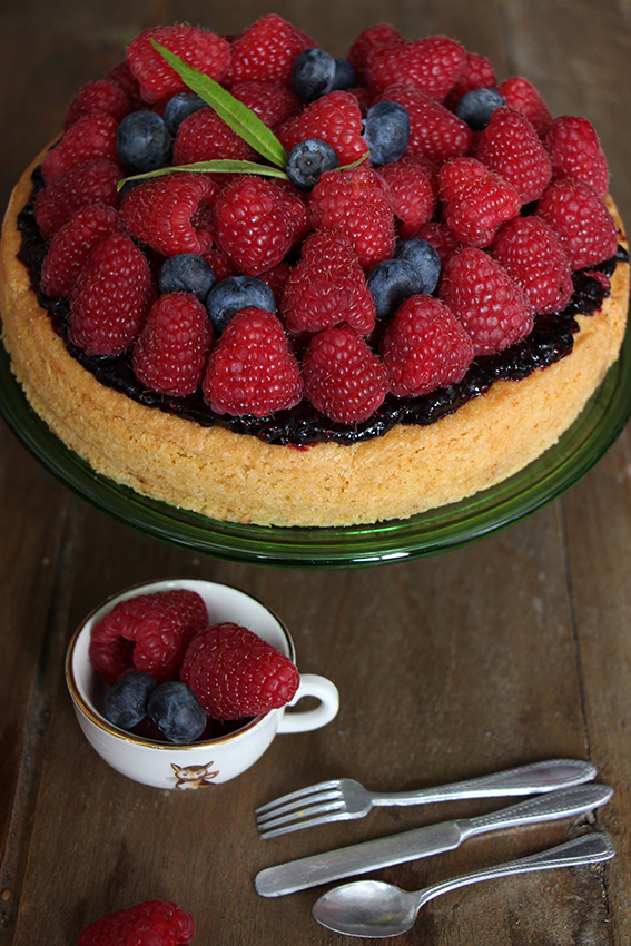 Etalez le coulis sur votre sablé puis les framboises. La base doit être bien ordonnée. vous pouvez vous arrêter là, et rajouter quelques myrtilles. Nous on a préféré donner à notre tarte une touche plus déstructurée et gourmande : on a fait une pyramide.
