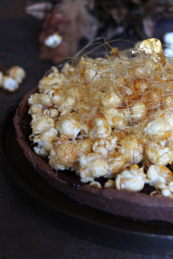Une tarte un peu starlette qui veut se la jouer très pop avec sa ganache chocolat-caramel qui vous fait fondre de bonheur, ses popcorn au caramel qui croustillent et vous mettent d’humeur très…pop song !