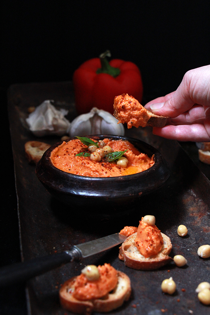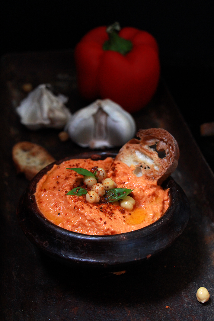 Rincez, et retirez la peau des pois-chiches. Si vous ne le faites pas le houmous sera plus granuleux. Dans un robot mixeur déposez les pois chiches, les poivrons rouges, l’ail, le sel, le piment et l’huile d’olive. Mixez une première fois. Rajoutez la tahina et le jus de citron. Mixez de nouveau jusqu’à ce que le houmous soit lisse. Goûtez et salez si besoin.