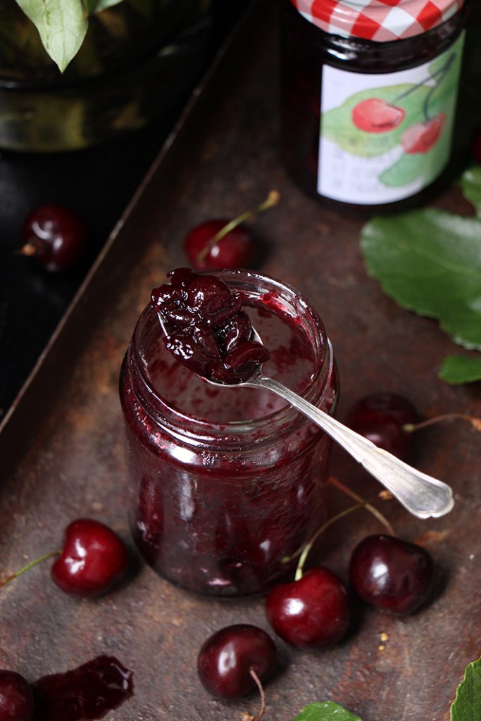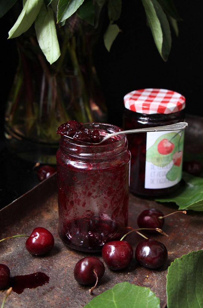 Ouais, ouais on a encore fait des cerises. Désolée pour ceux qui ne les aiment pas. Et oui, on a encore fait de la confiture, mais il y a une raison à toute cette redondance ! Début juin, nous sommes allées chez notre petite (feu) mémé. Après avoir tondu le mètre d’herbes qui avait envahi le jardin, nous nous sommes posées dans le jardin. Mais, les trois cerisiers nous faisaient de l’œil. La pose fut donc de courte durée. Sur le premier arbre les cerises étaient déjà abîmées. Sur le deuxième, elles n’étaient pas terribles en goût. Par contre sur le troisième, le plus petit, il y avait des tonnes de mini-cerises un peu acides et délicieusement parfumées. On n’allait pas toutes les laisser aux oiseaux. On s’est donc mis à cueillir les cerises avec l’aide du petit Jonas (4 ans) et son mini-panier. Comme nous avions déjà fait de l’eau de feuilles de figuier (recette ici), on s’est dit que peut-être les feuilles donneraient bon goût à notre confiture. Aussitôt pensé, aussitôt fait. Et bingo, cette confiture était délicieuse ! Le lendemain nous sommes donc retournés cueillir des cerises pour en faire encore et encore… Cueillez, faites des confitures et dévorez !