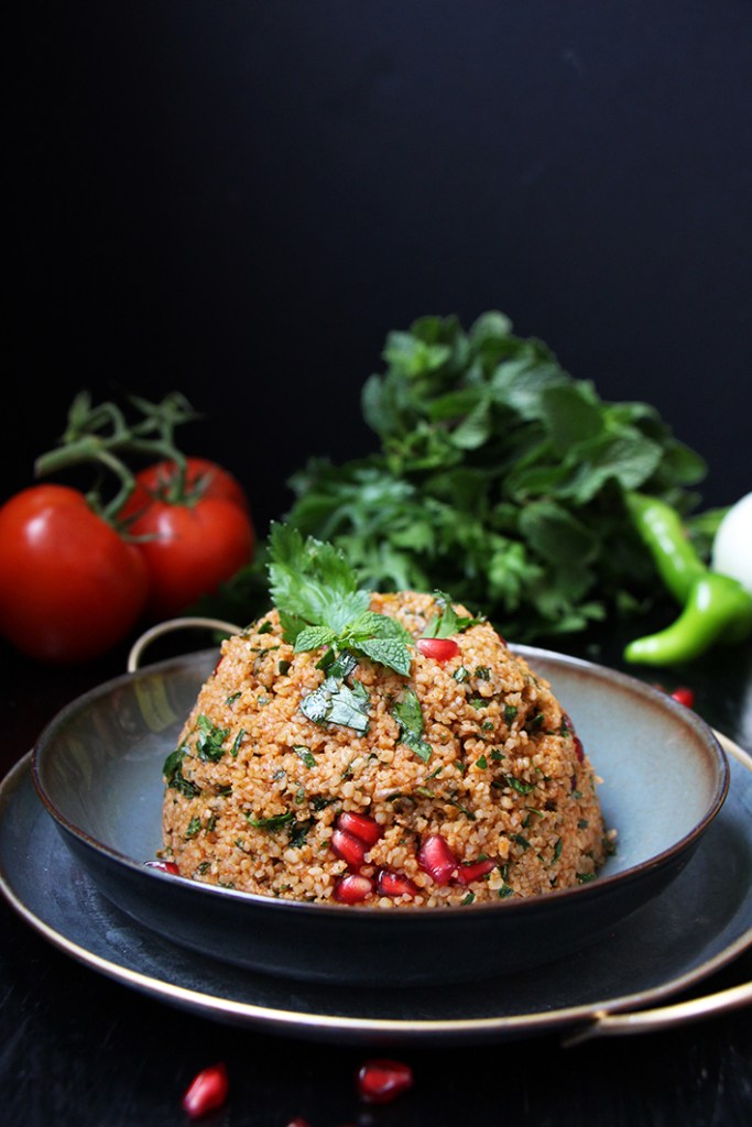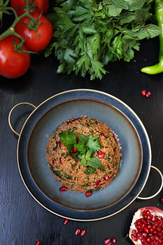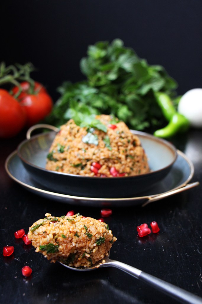 Pelez et émincez les légumes. Faites chauffer deux cuillères à soupe d’huile d’olive dans une poêle. Lorsqu’elle est chaude, ajoutez l’oignon émincé. Faites le cuire jusqu’à ce qu’il devienne translucide. Ajoutez le cumin en poudre et le poivre d’Alep. Faites revenir 2-3 minutes et ajoutez le piment, les tomates et le concentré de tomates. Salez. Poivrez uniquement si vous utilisez le mélange 4 épices à la place du poivre d’Alep. Laissez compoter quelques minutes. Passez ensuite cette sauce au mixeur. Réservez le temps qu’elle refroidisse. Égouttez votre boulgour si nécessaire. Ajoutez-y votre sauce tomate froide, la mélasse, les graines de grenade et la menthe sèche. Émincez finement vos herbes fraîches au mixeur ou au couteau. Ajoutez-les au boulgour. Rectifiez l’assaisonnement si nécessaire. Il ne reste plus qu’à verser votre préparation dans un joli plat. Parsemez de quelques feuilles aromatiques et de grains de grenade. Arrosez d’un filet d’huile d’olive. Dévorez !