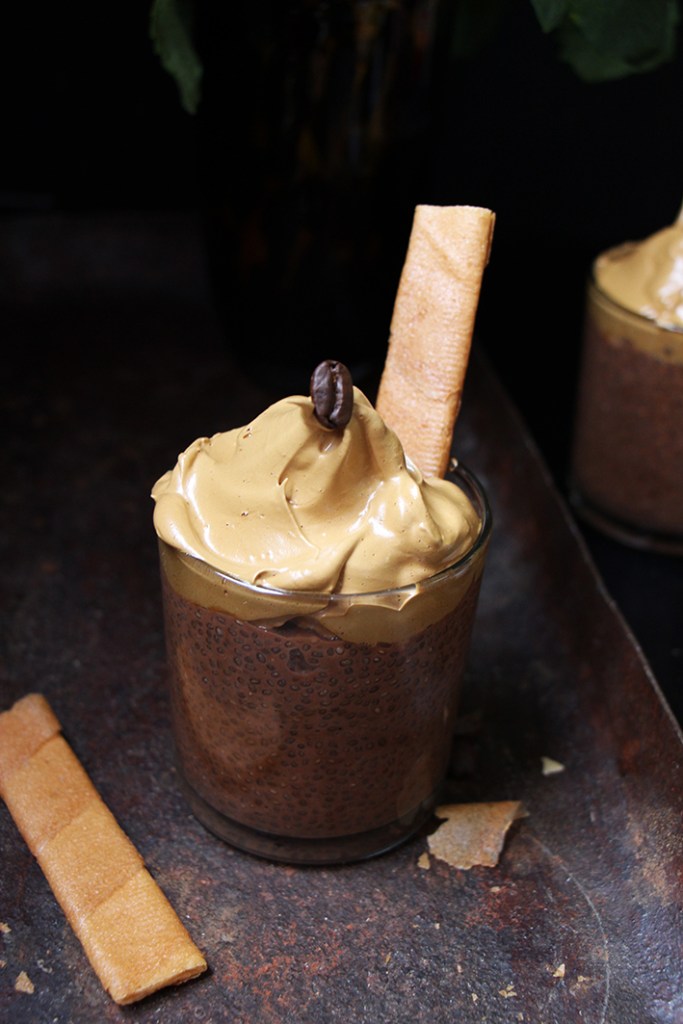 Dans une casserole, faites chauffer le lait végétal de coco. Faites-y fondre le chocolat noir. Une fois fondu, rajoutez le chia. Mélangez bien. Répartissez dans les verres ou verrines et réservez au frigo pendant 1h.