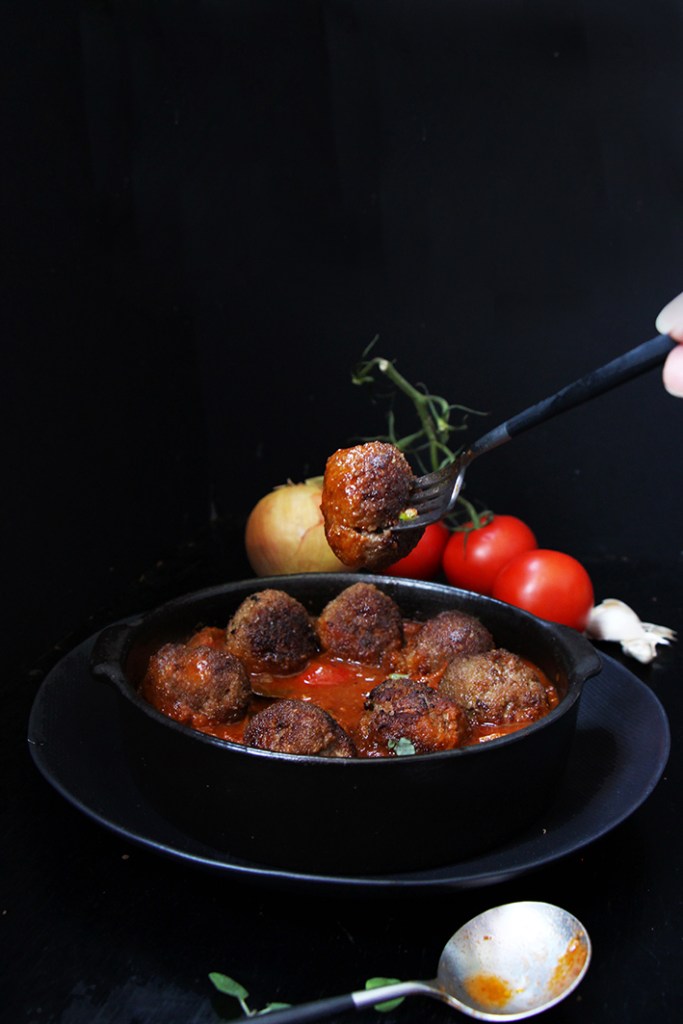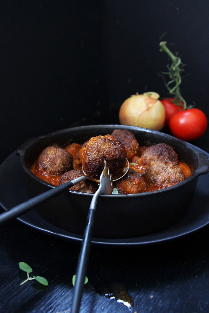 Il ne reste plus qu’à dresser ! Rectifiez la sauce tomate si nécessaire puis versez-la, chaude, dans un joli plat. Déposez par-dessus vos boulettes. Parsemez de quelques feuilles aromatiques si vous en avez. C’est prêt ! Dévorez !
