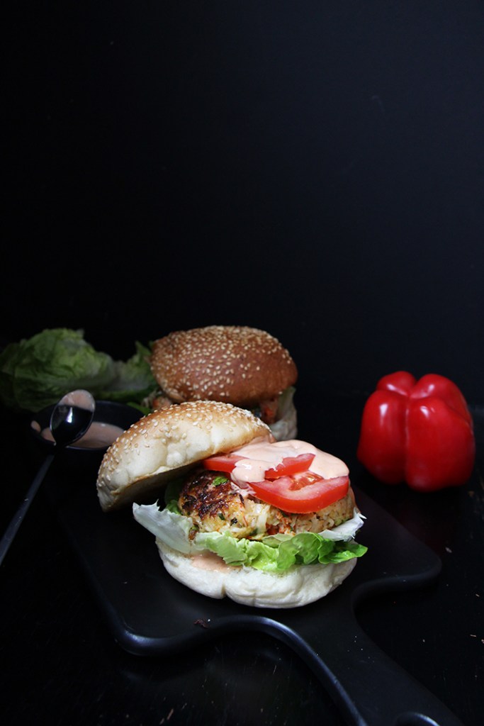 Mettez les buns coupez en deux dans le four position gril pour qu’ils soient chauds au moment du montage. C’est facultatif mais bien meilleur ! Étalez une cuillère de sauce sur le pain du dessous. Déposez, par-dessus, les feuilles de salade, un crab cake, puis une ou deux tranches de tomate et arrosez encore de sauce. Refermez et dévorez !