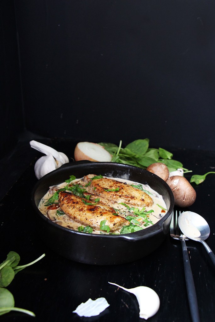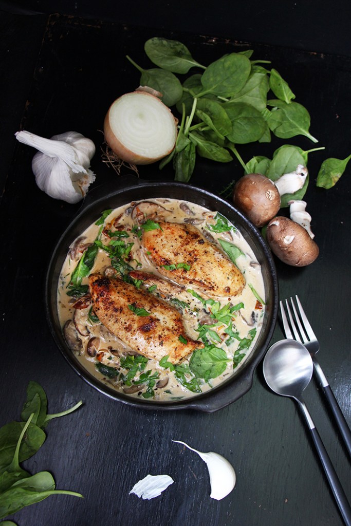 Dans une grande poêle faites chauffer de l’huile d’olive et faites revenir le demi-oignon émincé, jusqu’à ce qu’il soit translucide. Ajoutez l’ail et faites cuire environ une minute. Ajoutez les tomates séchées coupées en lamelles environ 2 minutes pour en libérer toutes leurs saveurs. Ajoutez les champignons. Mélangez délicatement pour ne pas abîmer les champignons. Versez le vin blanc ou le bouillon et, à feu doux, laissez réduire de moitié. Ajoutez la crème fleurette et portez à petite ébullition en remuant de temps en temps. Ajouter le parmesan et les herbes. Laissez mijoter pendant une minute supplémentaire jusqu’à ce que le fromage fonde dans la sauce. Salez et poivrez. Enfin ajoutez les feuilles d’épinard. Rectifiez. C‘est fini. Réservez.
