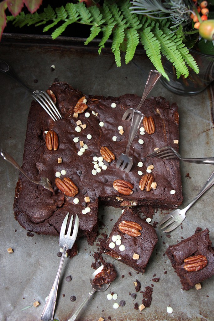 Lorsque la couche inférieure de brownie est cuite, retirez-la du four. Ne vous inquiétez pas si elle n’est pas complètement cuite. Parsemez toute la surface du gâteau de noix de pécan. Arrosez de caramel refroidi, puis saupoudrez de pépites de chocolat. Déposez le reste de la pâte à brownie sur le dessus et répartissez-la délicatement sur la surface totale du moule. Enfournez de nouveau pendant 20 minutes. Une lame de couteau enfoncée, doit ressortir propre mais humide. Pour une coupe facile, placez le brownie au réfrigérateur pendant au moins 2h voir pendant la nuit pour le raffermir.