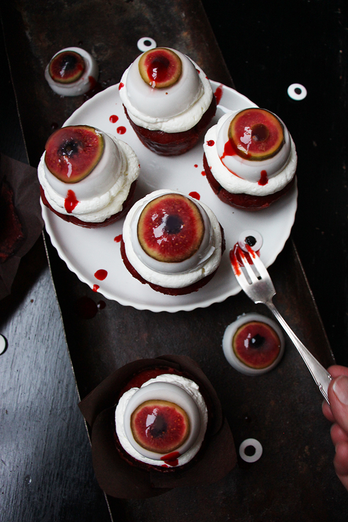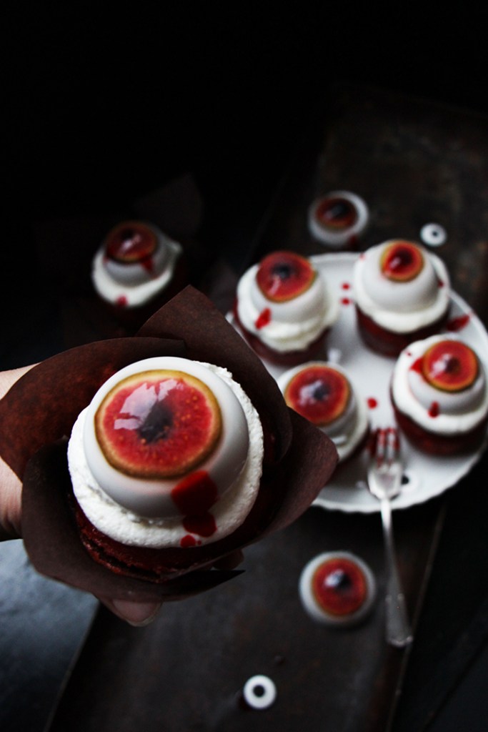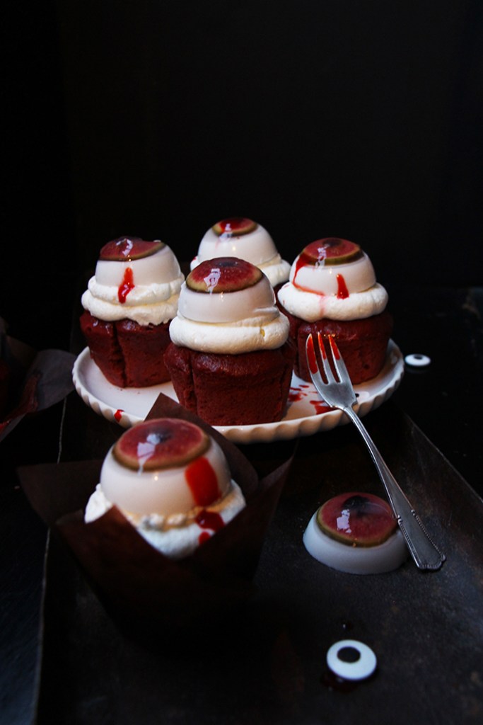 À l’aide d’une poche à douille ou d’une cuillère, déposez la crème chantilly sur vos gâteaux. Démoulez délicatement vos yeux affreux et déposez-les sur la chantilly. Éclaboussez le tout de sirop sanguinolent et dévorez !