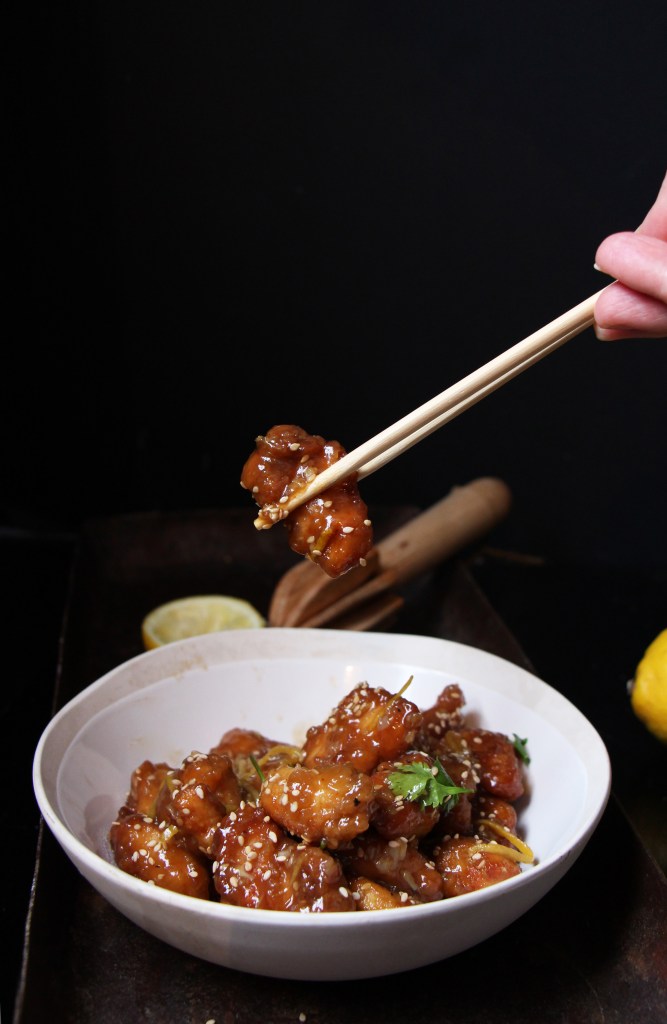Ajoutez la fécule de maïs délayée dans la sauce et remuez jusqu’à épaississement. Attention, c’est rapide. Ajoutez le poulet dans la sauce et mélangez pour que tous les morceaux soient bien enrobés. Salez et poivrez selon votre goût. Saupoudrez de graines de sésame, de ciboulette ou de coriandre émincées. C’est prêt, servez avec du riz ou des nouilles, dévorez !