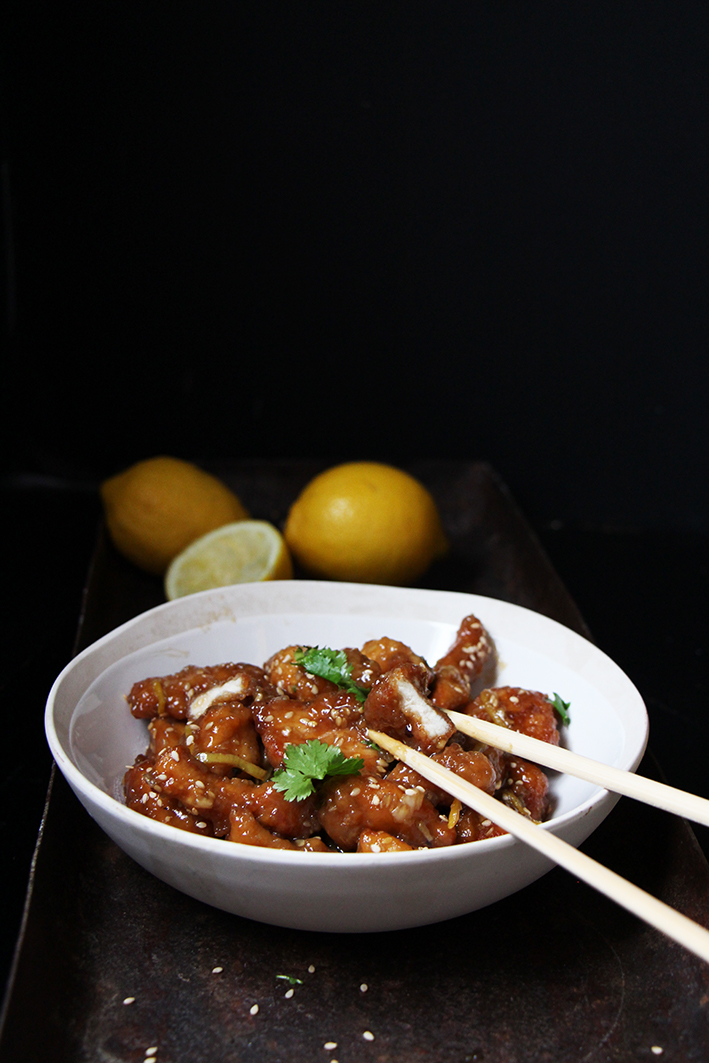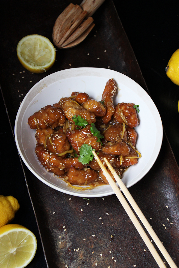 Trala lalalala la… Oui, assez de se morfondre. Let the sun shine, let the sun shin in… avec ce joli plat de poulet au citron à la chinoise ! Mais si, celui qui fait baver dans les vitrines des traiteurs asiatiques, mais, attention, en bien meilleur ! Regardez ces jolis morceaux de poulet, enrobés de soleil et brillants de sauce ! C’est du bonheur qui se déguste par petites bouchées. Vous souriez déjà ! Ben vous avez bien raison parce qu’en plus c’est délicieux, facile à faire, et le seul ingrédient un peu compliqué à trouver, est facultatif ! Que demander de plus ? Ben un peu de riz, s’il vous plaît, histoire de saucer pour ne pas perdre la moindre goutte de joie ! Alors n’attendez pas, cuisinez, partagez, dévorez !