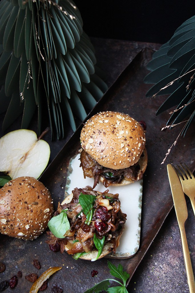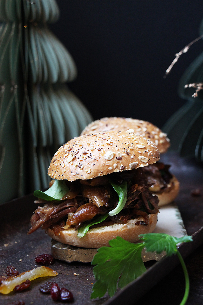 Répartissez la compotée d’oignons et fruits sur vos buns. Remuez la viande dans le plat de cuisson pour l’enrober de la graisse de canard. Ajoutez-la ensuite sur vos buns. Déposez dessus quelques feuilles de mâche et de persil. Refermez avec le chapeau et dévorez !