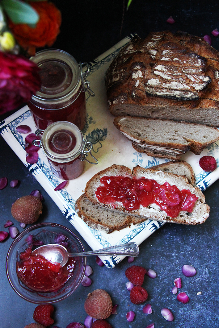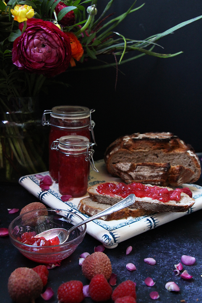 Oh la la, on ne va pas attendre la Saint Valentin pour vous faire de l’amour en pot ! Quelle idée ! Pourquoi attendre, alors que c’est maintenant qu’on en a besoin… Avec ce couvre-feu – comme si on était en guerre ! – à 18h, c’est une partie de la vie qui s’écroule, se réduisant à boulot dodo ! Pour les courses on repassera et pour le reste aussi ! En 39-45 – la vraie guerre – Il y avait aussi un couvre-feu, instauré en juin 40, par la Wehrmacht, et toute lumière, aux fenêtres, était interdite de 20h (ou 22h selon les régions) à 6h du matin ! Le black-out total ! Pour se réunir, les habitants des immeubles calfeutraient leurs fenêtres avec du papier noir ! Ambiance… On n’en est pas là, mais, on n’est pas en conflit armé non plus ! Alors pour faire passer cette amertume, on a fait cette délicieuse confiture, aux framboises, aux litchis – c’est la saison – et à la rose… De quoi illuminer la journée et vous apporter du baume au cœur. De l’amour, on vous dit ! Alors, cuisinez, aimez, partagez, dévorez !