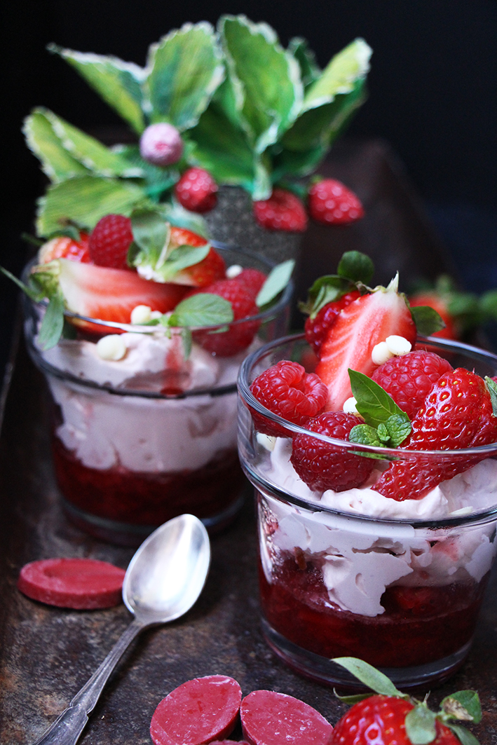 Filmez et laissez prendre 4 heures au frigo. Au moment de servir, décorez de fraises, de framboises, de pépites de chocolat blanc et de petites feuilles d’herbes aromatiques si vous en avez. Dévorez !