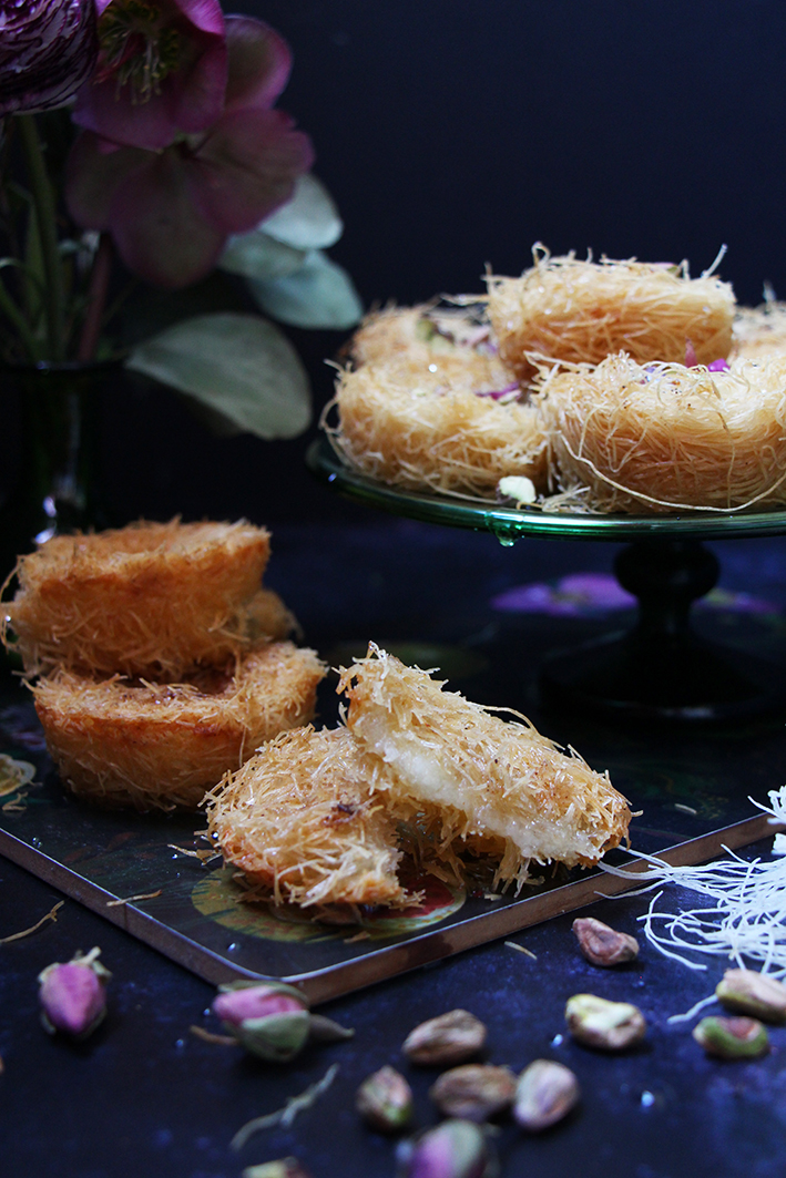 On vous a fait une pâtisserie bien de chez nous en Syrie. Mais attention, les puristes vont tomber dans les pommes, parce qu’on en a fait une version à notre sauce. Oui, parce qu’on a mélangé Kenafeh, qu’on a fait en version mini, et Aush Elbulbul, ou nid d’oiseaux, qui normalement, sont tout petits, et ne sont pas farcis de fromage, mais juste de pistaches ou autres noix. En plus, comble du sacrilège, on a ajouté de la ricotta, pour plus d’onctuosité et on l’a aromatisé alors que, ben normalement, seul le sirop l’est ! Et on a mélangé eau de rose et fleur d’oranger ! Bref, on vous a fait n’importe nawak mais c’est délicieux et même notre papa a validé ! Pour celles ou ceux qui ne connaissent pas, ce sera une découverte. La seule difficulté est d’abord de trouver des vermicelles de Kadaïf, en épiceries orientales et peut-être de rouler les vermicelles en nids. Après, tout n’est que gourmandise. Alors, pâtissez, partagez, dévorez !