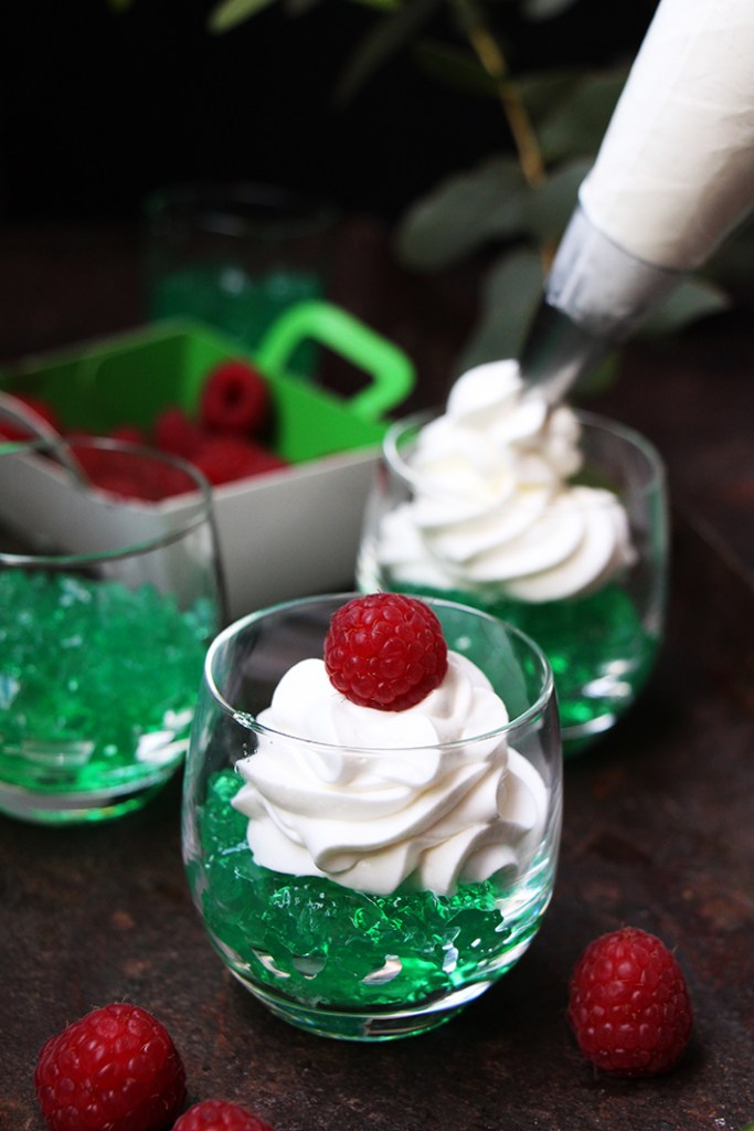 À l’aide d’un couteau, ou d’une fourchette, cassez la gelée en petits cubes. Répartissez-la dans les verrines, puis déposez une jolie couche de chantilly. Finissez par une framboise, ou deux, et un peu de menthe ciselée. Dévorez !