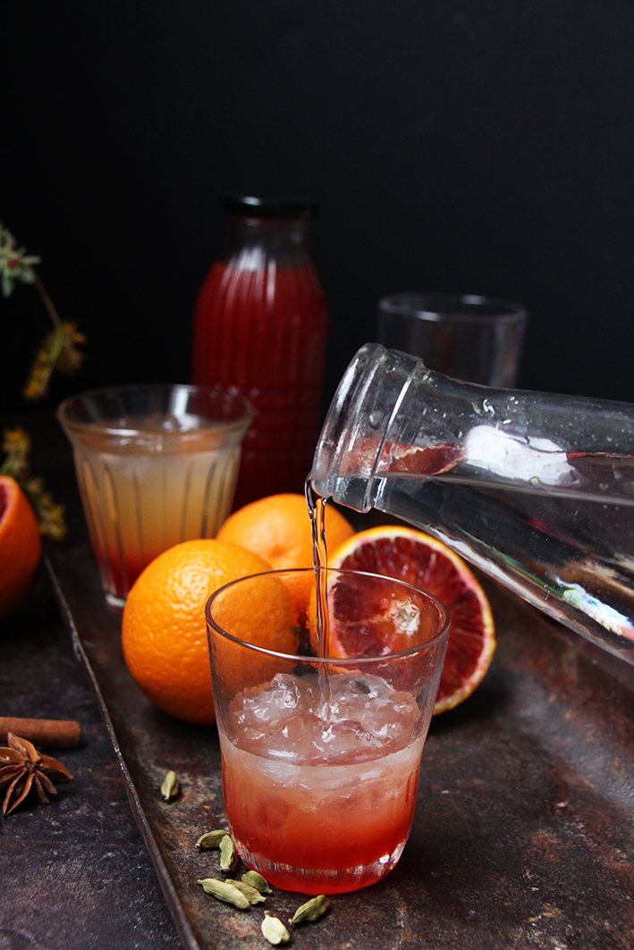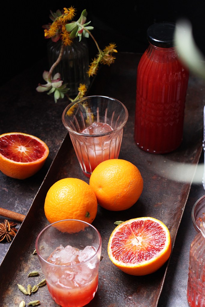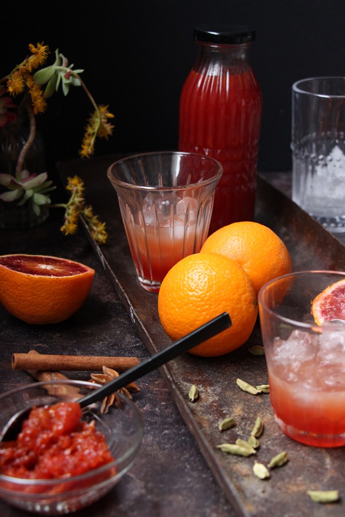 « Les bons souvenirs sont des bijoux perdus»* que l’on retrouve, pourtant, quand on ne s’y attend pas, qui se rappellent à nous, au détour d’une pensé, d’une parole, d’un chemin. Nous, nous avons des souvenirs gourmands attachés à ceux de notre vie à Alep. Souvenirs olfactifs, gustatifs, ancrés, mêlés à ceux de la famille, des amis. Alors, quand on a vu ces belles oranges bio sanguines, on s’est remémoré les sirops qu’Aline, puis Leila, sa fille, notre copine d’enfance, nous faisaient et que l’on dégustait, sur la terrasse ou dans le jardin de leur maison familiale à Shahba, le quartier chic de la ville. La fraîcheur des orangeades servies était d’une infinie douceur par rapport à la fournaise que le soleil s’appliquait à attiser ! A bien y réfléchir, il n’y avait pas, à l’époque, de sirops industriels. Ou peut-être que si, très chers, mais nous n’en avions pas à table, ni dans notre famille, ni ailleurs. Il y avait des « Gazozes », boissons gazeuses, orange fluo (ou autre selon le goût), au goût chimique, et bourré de colorants, qui nous coloraient la langue. Rien à voir, donc, mais on adorait ! Bref… Aline et Leila, faisaient ce sirop avec des oranges normales et sans épices. Mais nous n’avons pu ni résister à la couleur rouge de ces oranges, ni à ajouter un petit twist épicé. Alors si vous voulez un délicieux sirop aux vrais fruits, faites comme nous, cuisinez, partagez, dévorez !