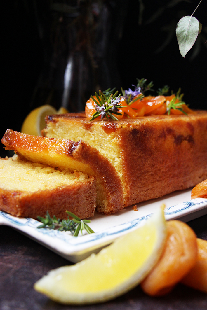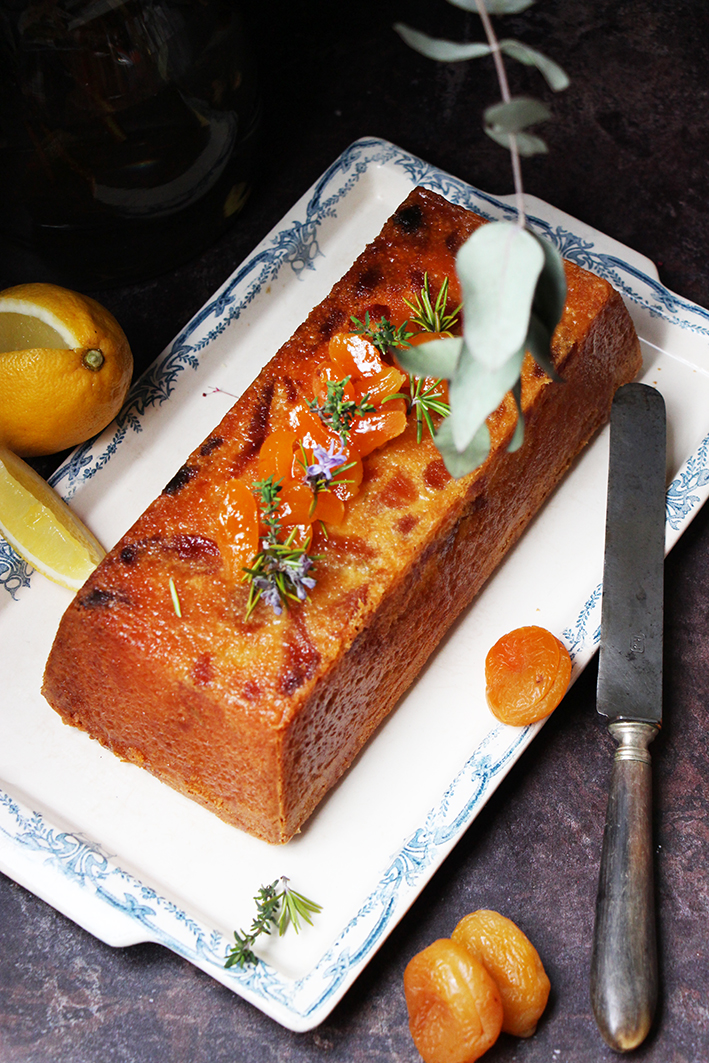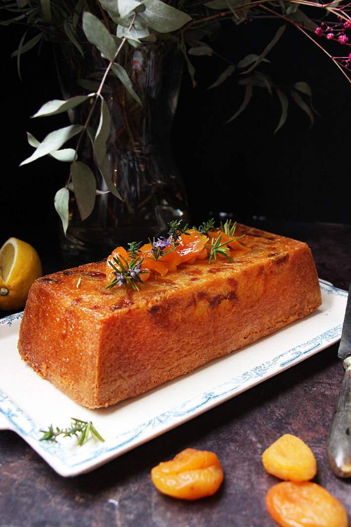 Lorsque vous pensez que le cake est cuit, piquez-le avec la lame d’un couteau pour vérifier (on ne sait jamais). Si la lame ressort sans pâte, c’est bon. Sinon, rebelote au four ! C’est cuit, alors laissez-le un peu refroidir avant de le démouler dans un beau plat et imbibez-le de tout le sirop, (débarrasser du romarin). Soyez généreux ! Décorez d’abricots et de romarin. Dévorez !