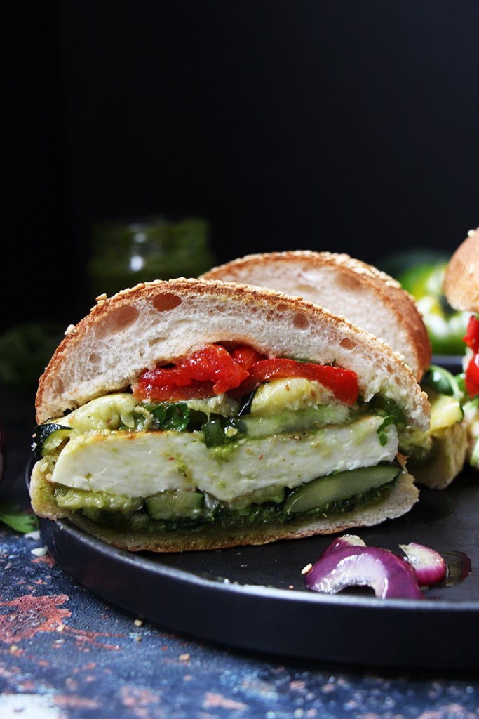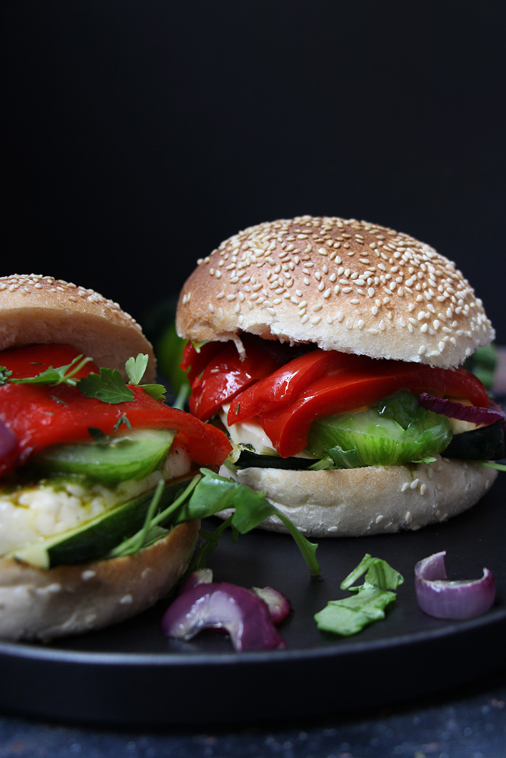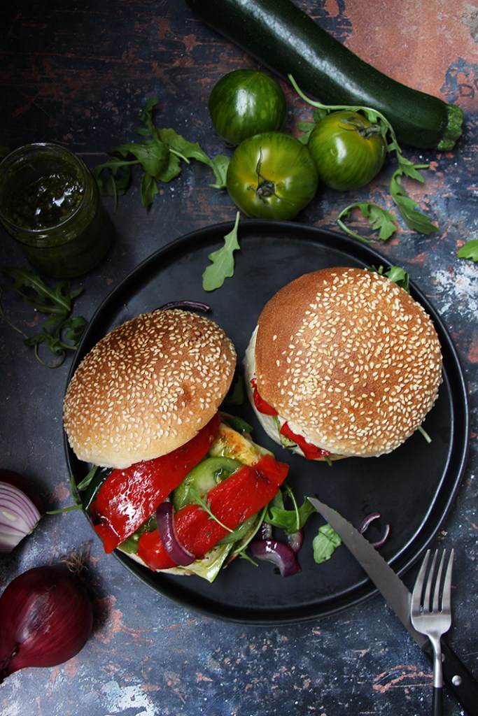 Assemblez les burgers en déposant une grosse cuillère à soupe de pesto sur chaque petit pain. Garnissez d’une poignée de roquette et des tranches de courgettes. Ajoutez le haloumi. Rajoutez un peu de pesto. Couvrez de tranches de tomates, de poivron rouge et d’oignon. Replacez le chapeau du buns. Dévorez !