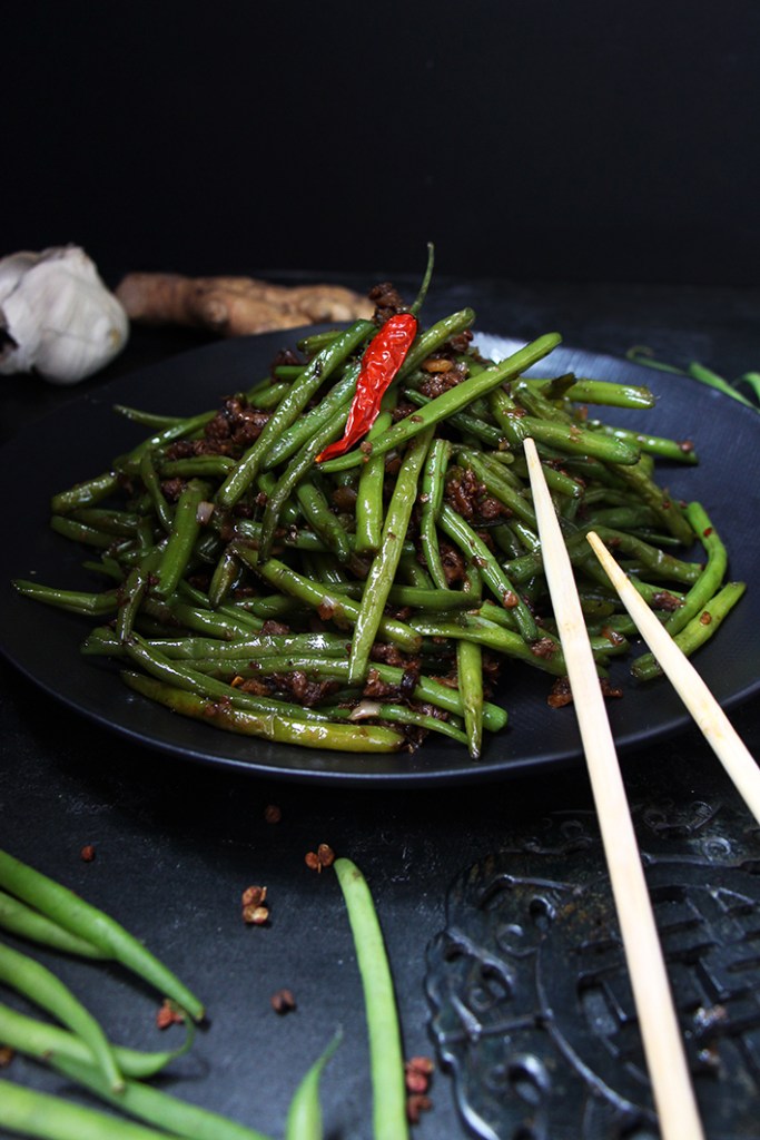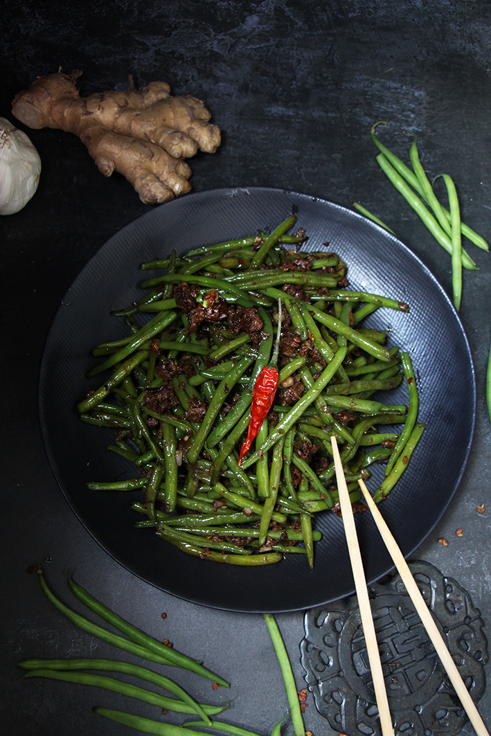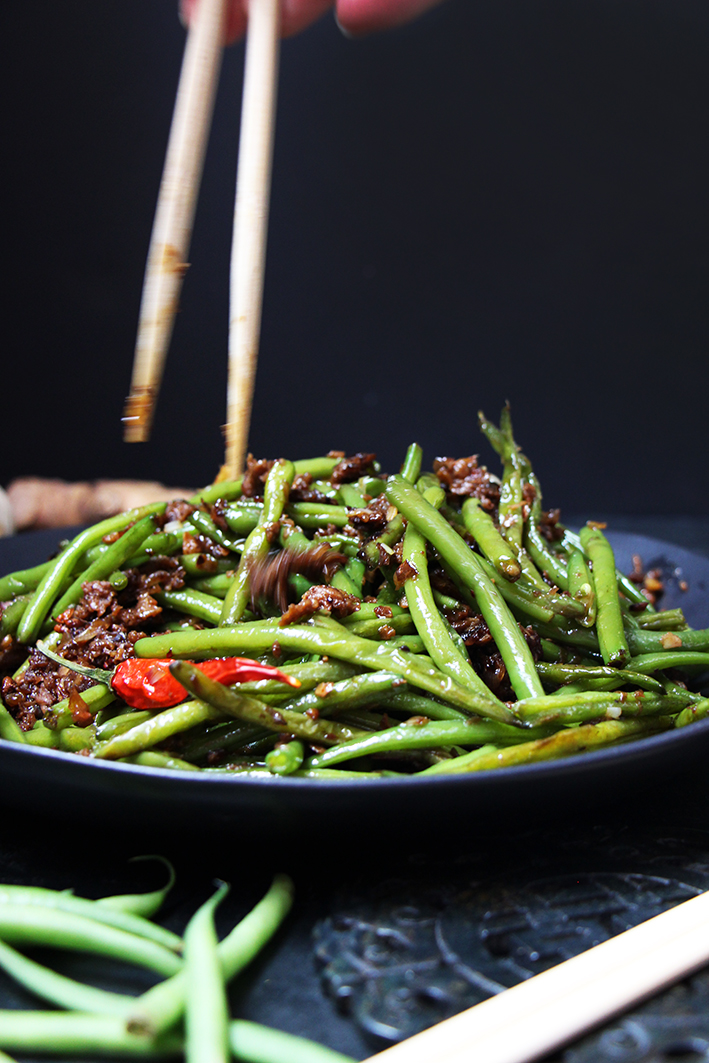 Voilà, voilà, il y a deux semaines, on est allées déjeuner chez Gros Bao, avec des amis. L’endroit nous a tellement rappelé Hong Kong, avec toutes ces petites suspensions rouges typiques des marchés de rues. On a adoré. Et les saveurs n’étaient pas en reste. Les aubergines sont délicieuses, les raviolis avec le bouillon qui explose en bouche, le Mapo tofu, n’en parlons pas ! Bref… Il y avait aussi des haricots verts Sichuan style, au haché végétal, trop trop bons. Evidemment, on s’est tout de suite dit qu’il fallait qu’on les refasse pour le blog ! Et donc, ne reculant devant rien, on a voulu essayer le steak végétal, (Les nouveaux fermiers). Soyons honnêtes, on a trouvé ça très-très-très bizarre, tant dans la texture – on dirait un peu du boudin noir – qu’en ce qui concerne le goût et l’odeur ! Comme dans notre recette le steak est haché en mini-morceaux, super-grillé et enrobé de délicieuses saveurs, au final, ça allait super ! Mais on ne mangerait pas un steak entier pour un burger, par exemple… Trop expérimental ! À la base, on voulait prendre le haché végétal (même marque), comme chez Gros Bao – autant copier jusqu’au bout ! – mais, il n’y en avait pas dans notre supermarché. La composition n’est pas la même ! Bon bref, faites avec ce que vous trouvez, du veg ou pas… Au final, nos haricots étaient délicieux, Si, si, on vous l’assure, même avec ce haché chelou ! Alors faites comme nous, cuisinez, testez, partagez, dévorez !