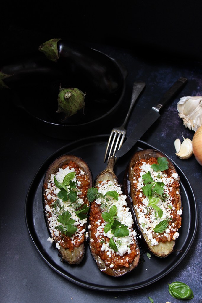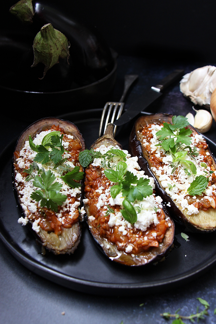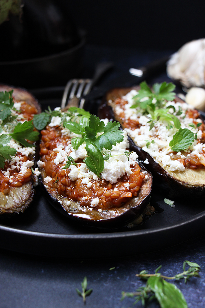 Aubergines farcies au petit épeautre, sauce tomate et feta