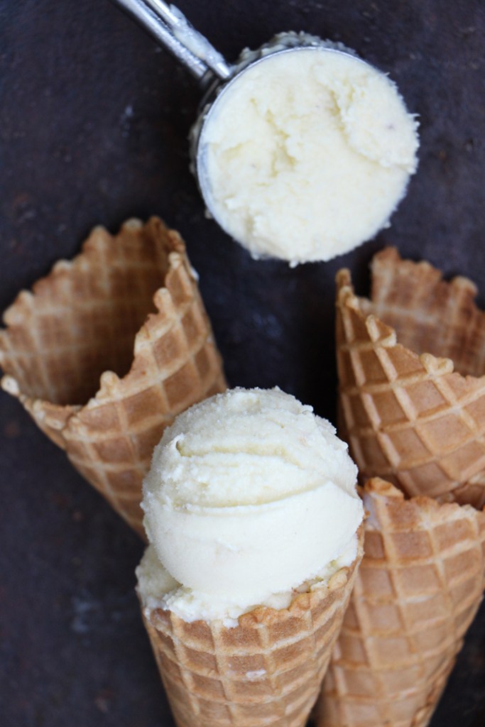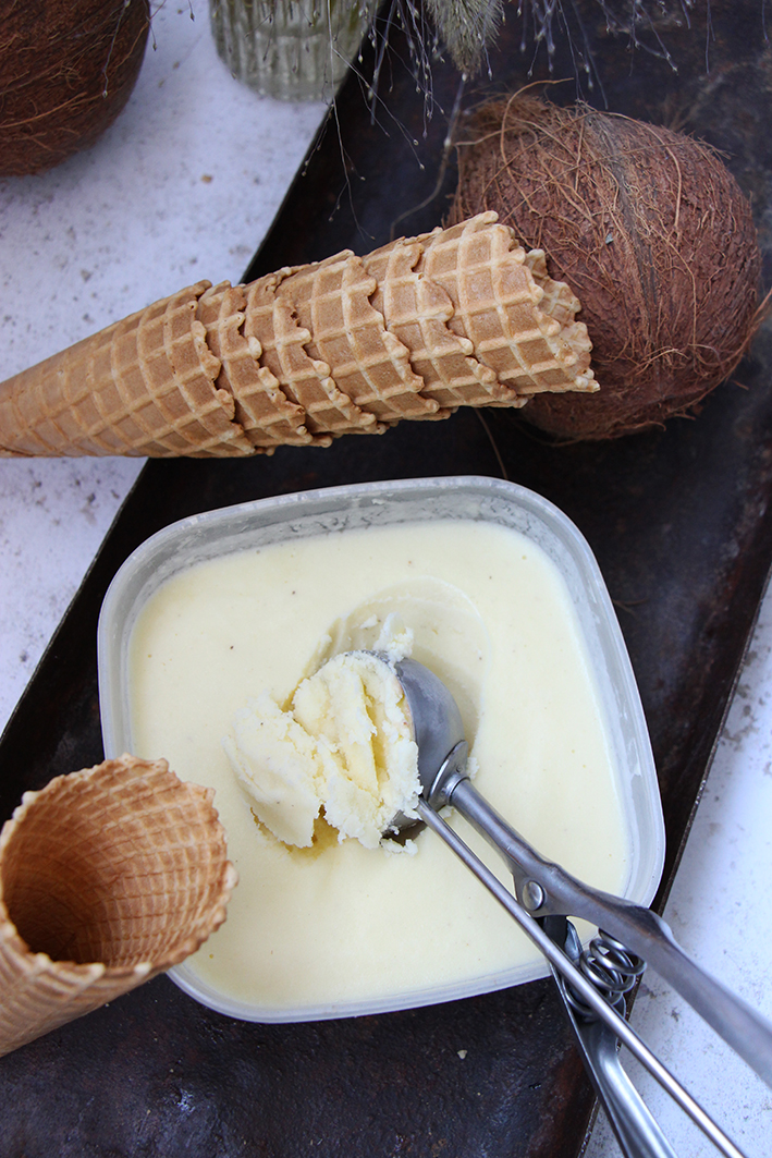 Mettez tous les ingrédients congelés, le rhum et le sirop de sucre de canne dans un blender et mixer jusqu’à ce que l’ensemble prenne la consistance d’une crème onctueuse. C’est un peu fastidieux. Notre blender était poussif. Aidez-vous d’une spatule ou d’un manche de cuillère en bois pour, de temps en temps, mélanger les morceaux non mixés. Rectifiez le sucre si besoin. Évidemment, vous pouvez dévorer cette crème tel que. Mais nous, on voulait faire une glace ! Du coup, transvasez la préparation dans un contenant hermétique, type Tupperware, et placez-le au congélateur au moins 6 heures Une cuillère à glace, des cornets et voilà, le tour est joué… Dévorez !