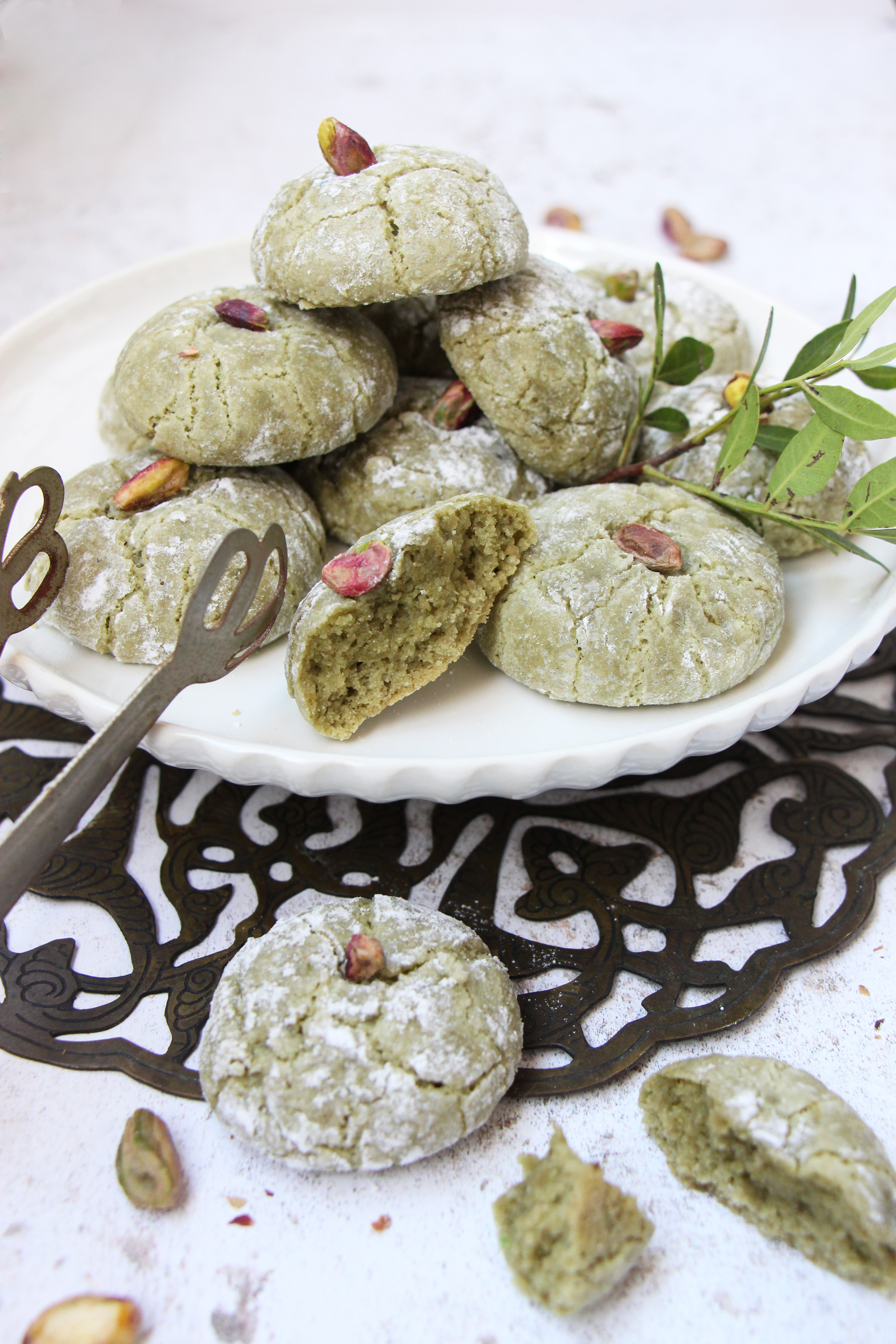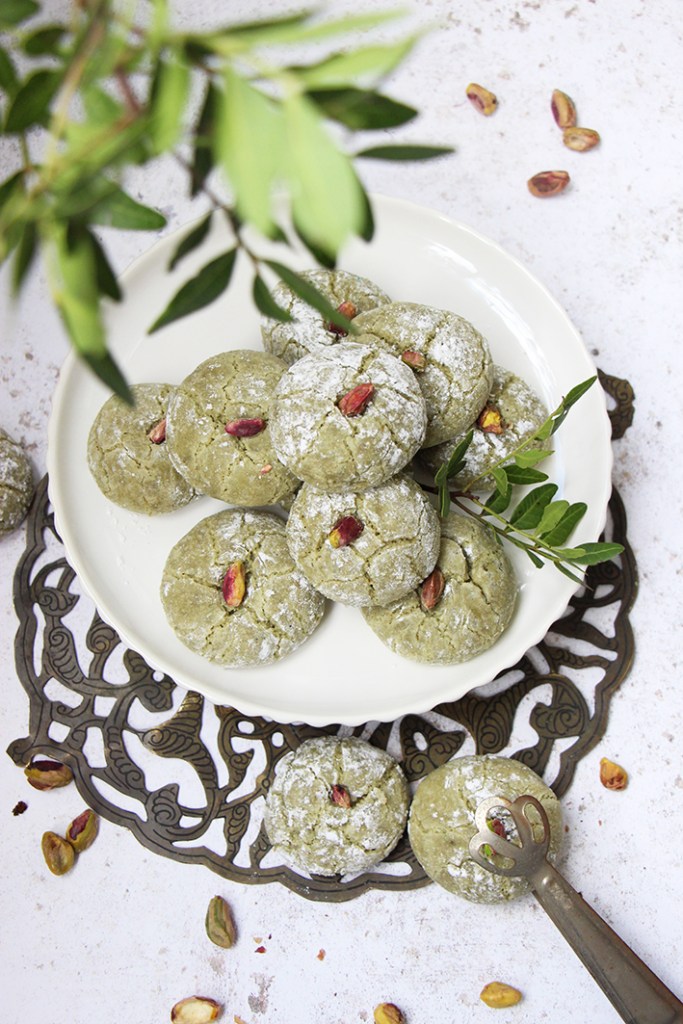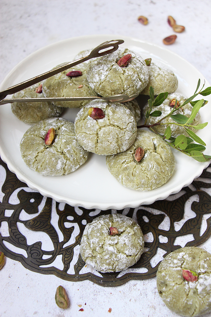 Il ne reste plus qu’à former des petites boules entre vos mains et de les rouler dans le sucre glace. Une fois roulés dans le sucre, les gâteaux seront plus faciles à manipuler. Déposez-les sur une plaque recouverte de papier sulfurisé. Décorez d’une petite pistache crue au milieu de chaque gâteau. Enfournez 15 minutes (selon les fours). Les gâteaux doivent encore êtres moelleux à la sortie du four. Laissez-les refroidir. Dévorez !