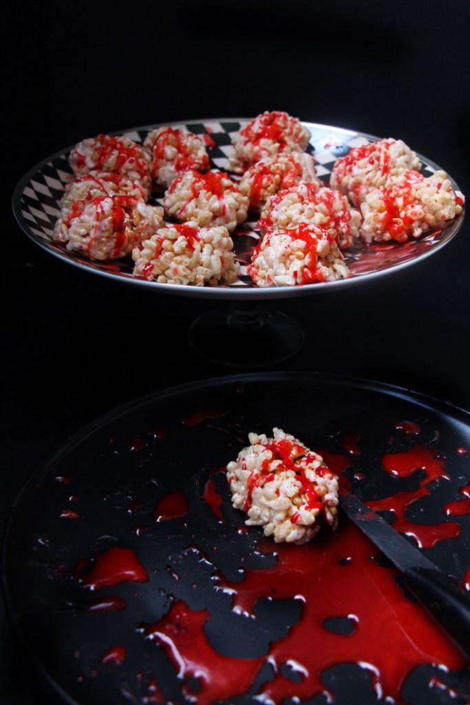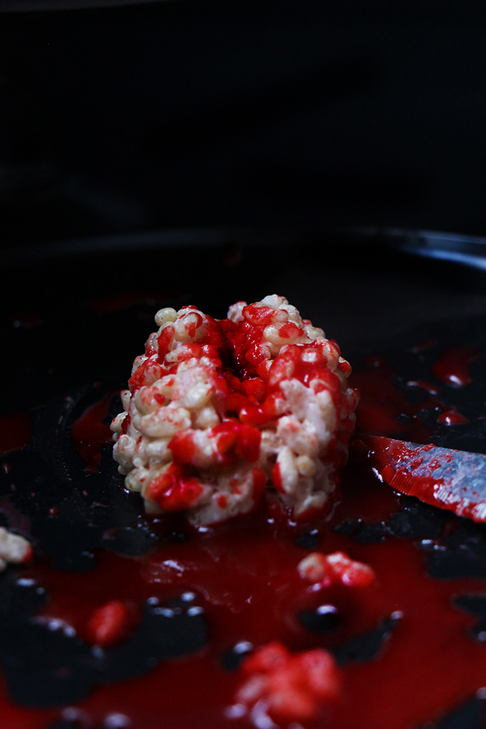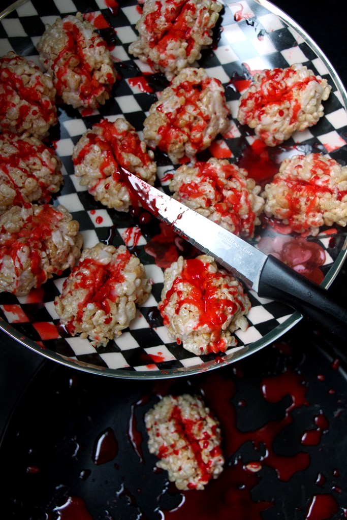 Utilisez du glaçage blanc pour blanchir un peu la cervelle, puis le glaçage rouge dans la rainure du milieu et pour éclabousser le cerveau. Heu, oui c’est Halloween, l’aviez-vous oublié !