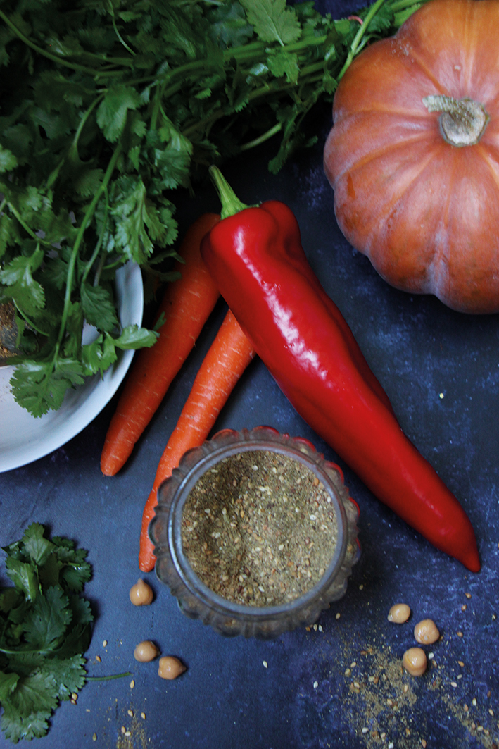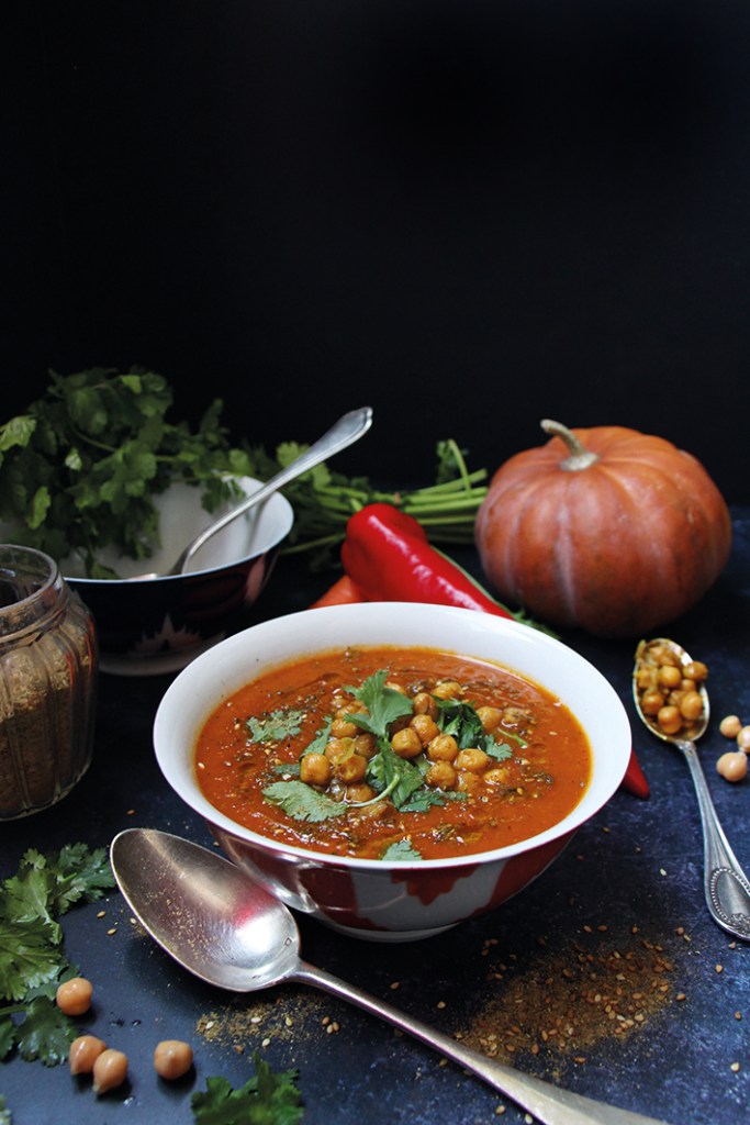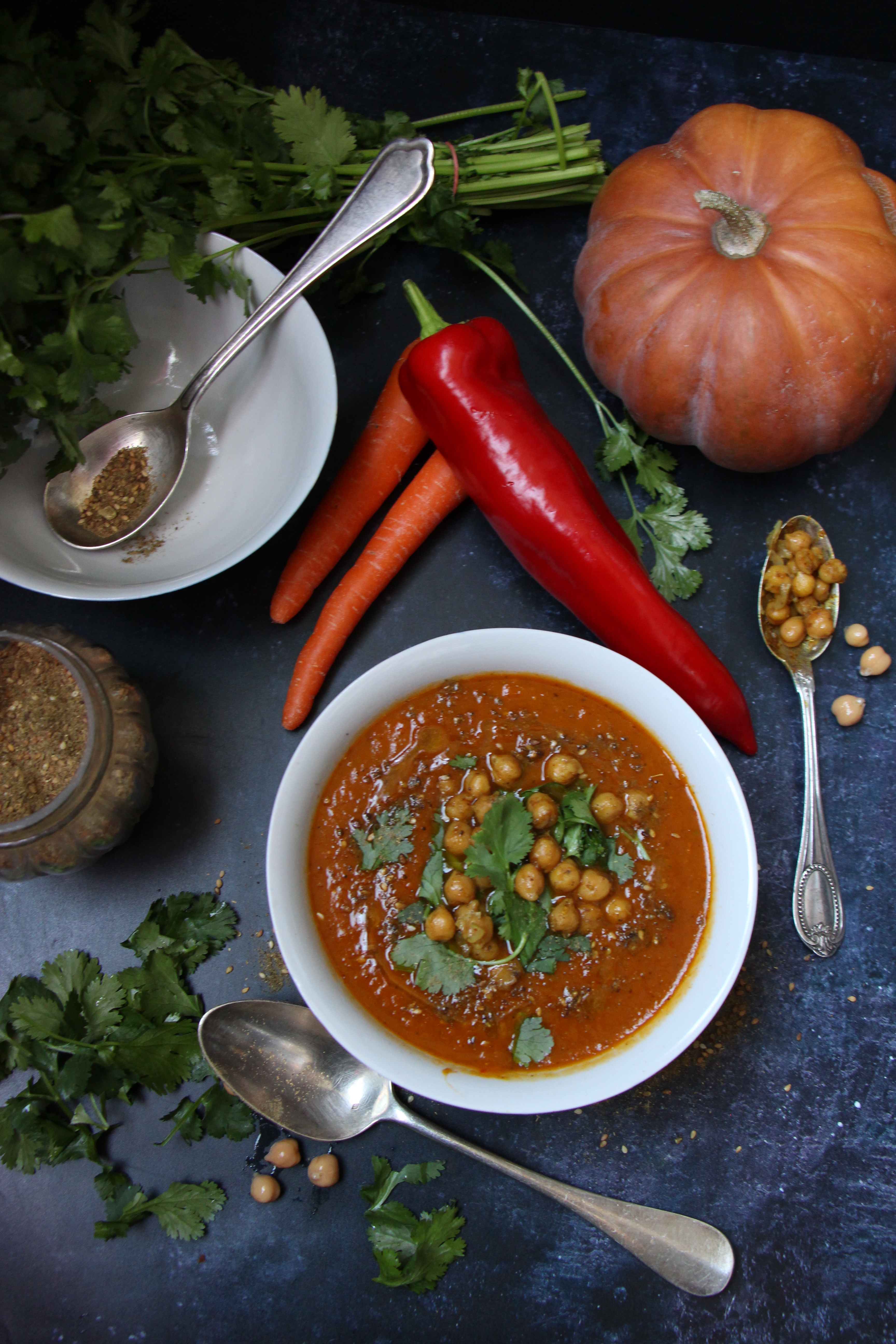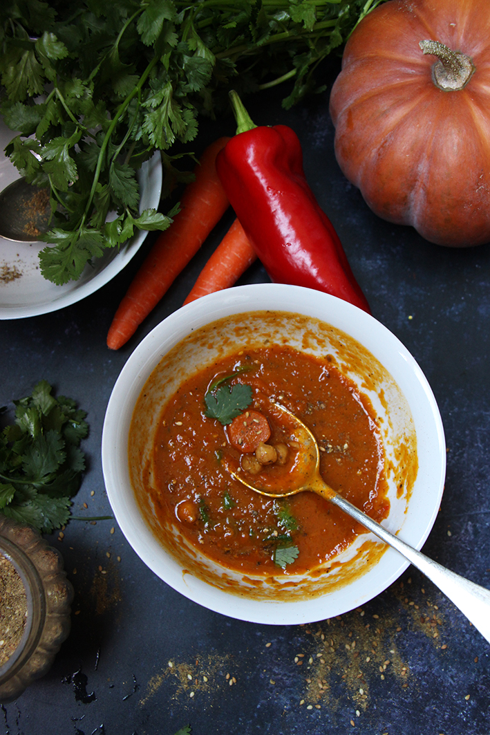 Mixer la soupe jusqu’à obtenir une consistance lisse. Servez-la, parsemée de coriandre, de pois chiches rôtis, de quelques gouttes d’huile d’olive et saupoudrée de zaatar. Dévorez !
