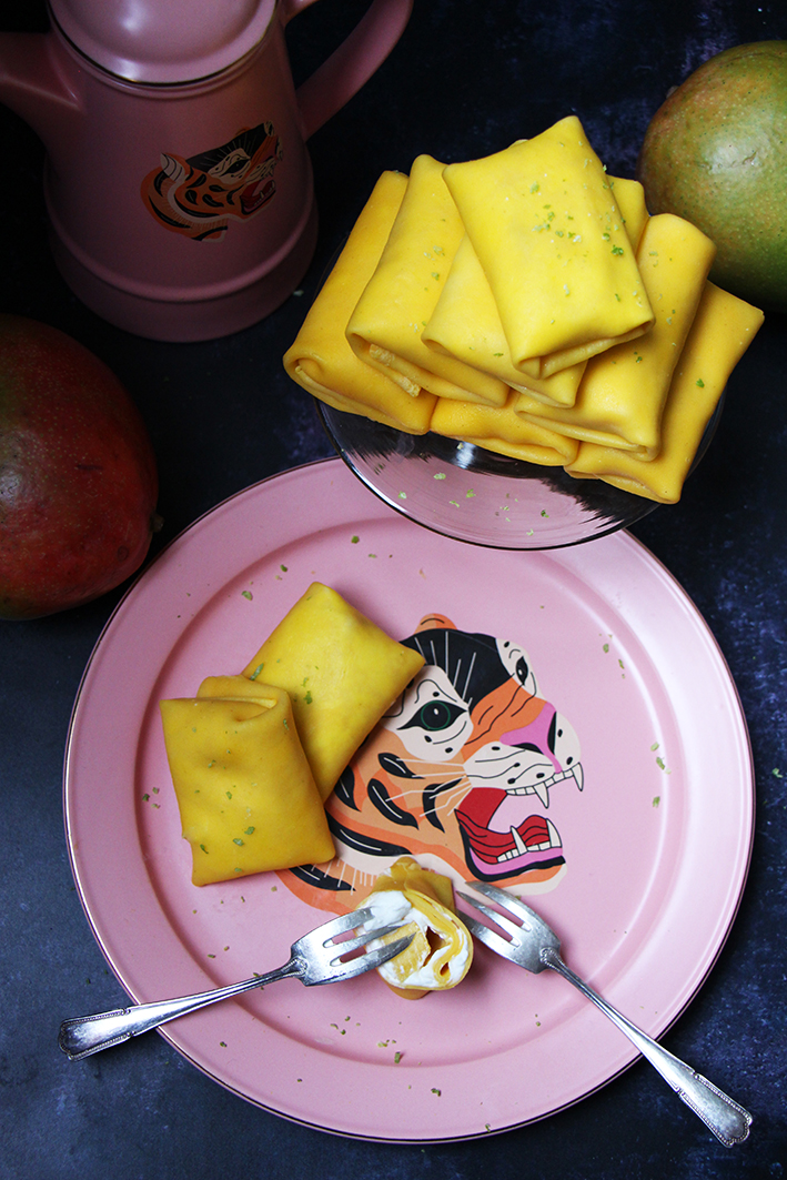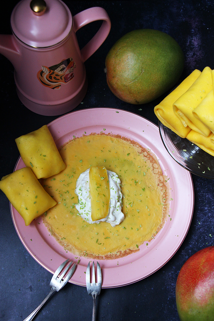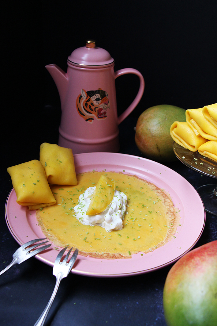 Déposez une crêpe sur une assiette, côté non cuit vers le bas. (Pas comme sur la photo. On voit bien, sur les bords de la crêpe, que le côté cuit s’est teinté de caramélisation. Ce qu’on veut c’est la couleur uniforme du côté non cuit – apparent sur la photo ! bref…). Déposer un peu de chantilly au milieu de la crêpe. Déposer un morceau de mangue dessus, puis recouvrez d’encore un peu de chantilly. Enveloppez la garniture de crêpe de façon à former un oreiller. Placez vos pancakes sur un joli plat et saupoudrez-les du zeste du citron vert. Dévorez !