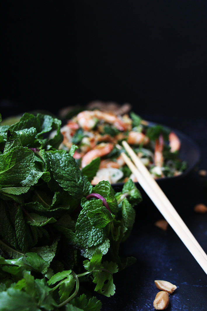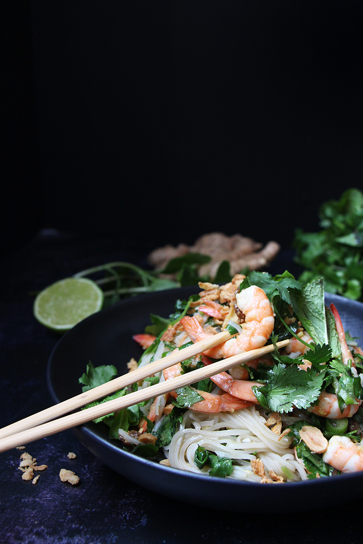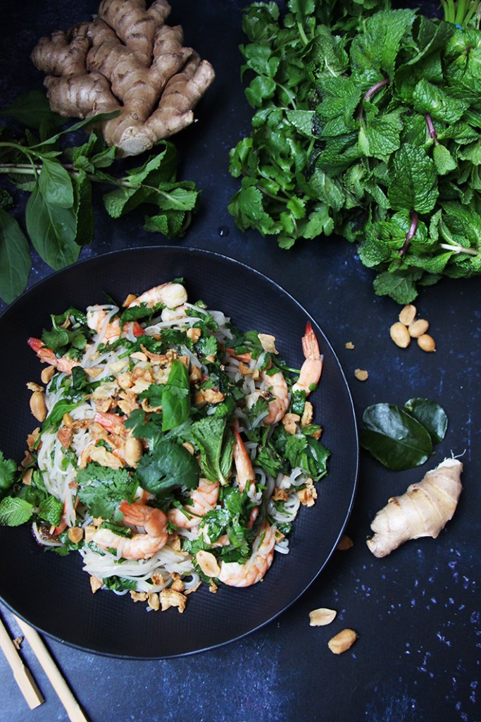 Mélangez les nouilles légèrement huilées et les crevettes. Versez la sauce dessus. Rajoutez les herbes. Mélangez bien le tout. Parsemez de cacahuètes et d’échalotes frites. Servez, dévorez, c’est tellement frais !
