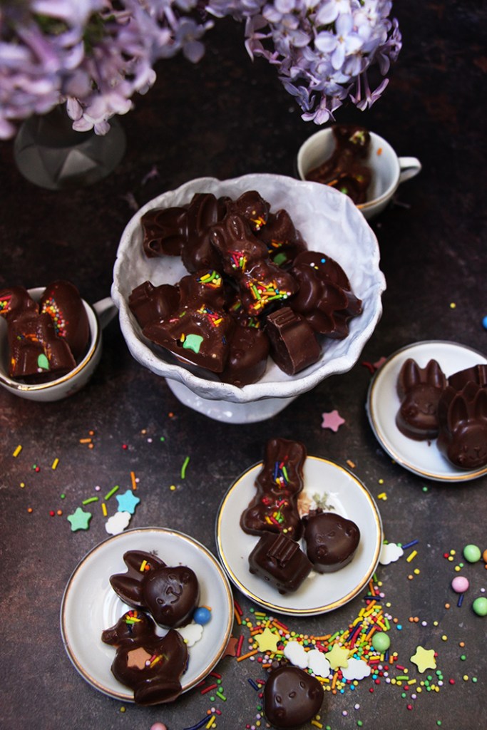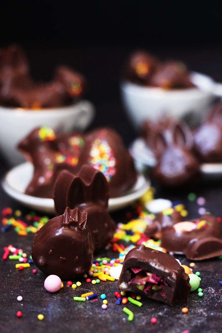 Plus simplement, vous pouvez disposer des vermicelles multicolores au fond des empreintes et couler le chocolat pardessus. Laissez refroidir au frigo 15 mn. Démoulez et dévorez !
