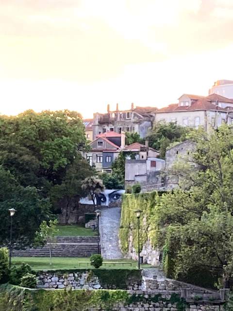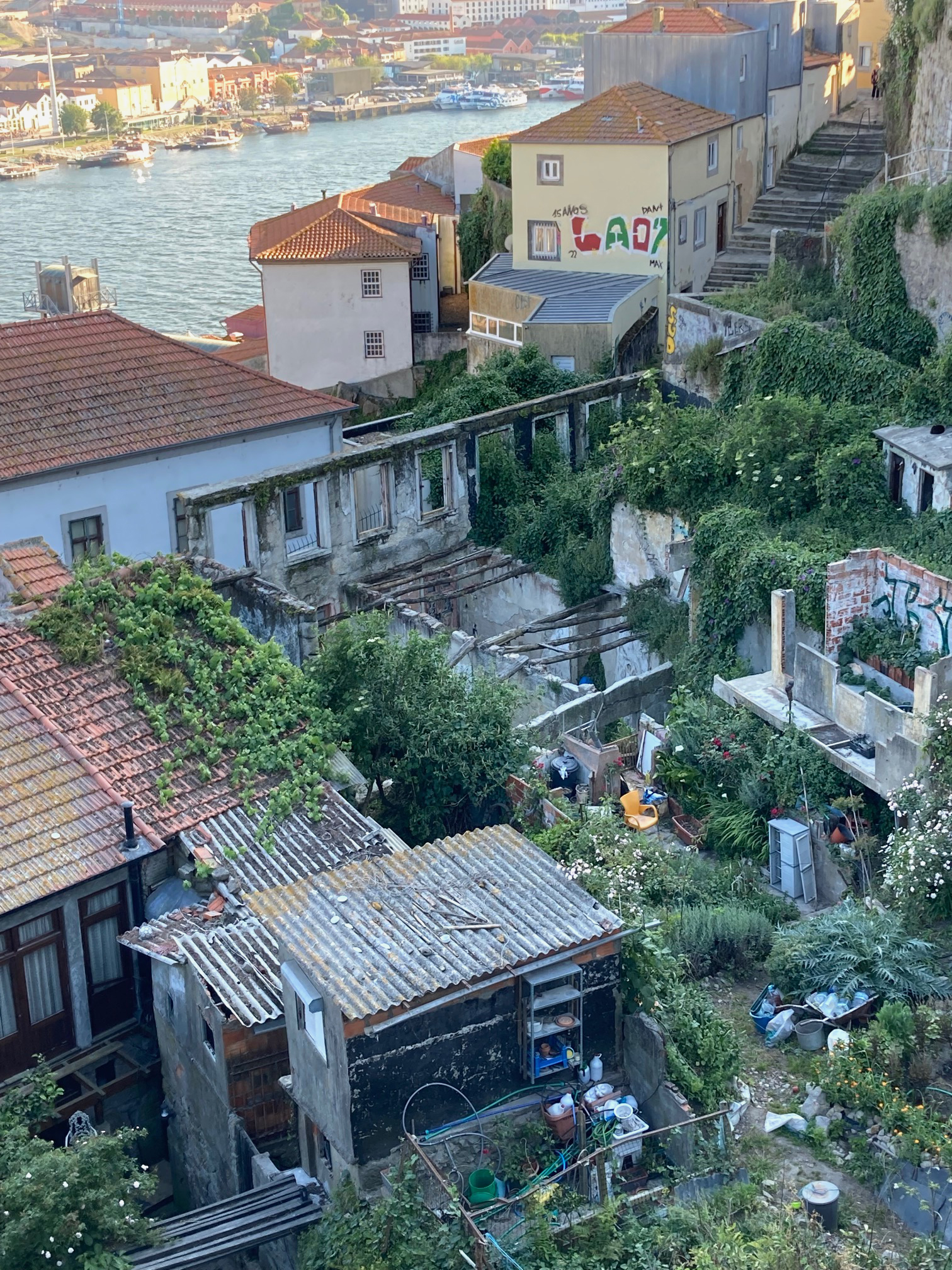 Comme elles sont jolies ces maisons ornées de carreaux de faïence et… abandonnées. Derrière la beauté se cache la misère ! C’est ce qui nous frappe tout de suite. Beaucoup d’habitations, des plus modestes aux plus nobles, de boutiques, d’entrepôts ou autres ne sont plus que carcasses vides. Toits effondrés, portes et fenêtres murées, façades décrépites… Partout dans la ville, ce même spectacle de désolation s’offre à nous. Bon nombre d’entre elles portent la mention à vendre, d’autres affichent sur leurs façades des avis, dont on n’a pas trop compris la teneur. Peut-être des mises en demeure d’expropriation par la mairie, en vue de les réhabiliter ! Ce serait bien. Mais la tâche est colossale. On avait lu que le quartier historique s’était vidé de ses habitants. Mais là, c’est incroyable, car le phénomène affecte tous les quartiers y compris ceux très touristiques et du bord du fleuve. Imaginez l’île de la Cité, ou les Champs Élysée, bordés de bâtiments murés ! On pourrait croire que cette désolation s’explique par la marchandisation des biens à visée touristiques donc lucrative, qui empêcherait la population locale de ce logeait. Mais la multiplication des appartements touristiques n’explique pas tout et même, elle contribue à la réhabilitation de bon nombre de ruines. Non, Porto est une vieille ville avec ses maux, et pendant longtemps, une politique des loyers gelés à une somme dérisoire, mise en place par en 1947 par Salazar, qui a perduré pendant des décennies, n’a pas aidé les propriétaires à rénover leurs biens. D’autre part, la ville, dans les années 70, a décidé d’une politique de logements sociaux hors-les-murs, avec tout le confort moderne qui manquait en ville, ainsi, ce sont pour la plupart les personnes âgées, qui sont restées, et leurs maisons ont vieilli avec elles. D’ailleurs, à y regarder de près, beaucoup de maisons habitées ne sont pas en bien meilleur état. Nous, on ne voyant dans ce flot de misère que de belles pépites à sauver. On se prenait à rêver que l’on avait touché le jackpot de l’Euromillions pour racheter ici, cet immense bâtiment des pompes funèbres recouvert de carreaux de faïence verts, là cette maison à la façade bleue, et là au bord du Douro, cet immense entrepôt envahi par la végétation. Ça, on en avait plein la tête des projets immobiliers à lancer, des trésors à rebâtir… Parce qu’elle est tellement belle cette ville malgré ses oripeaux !