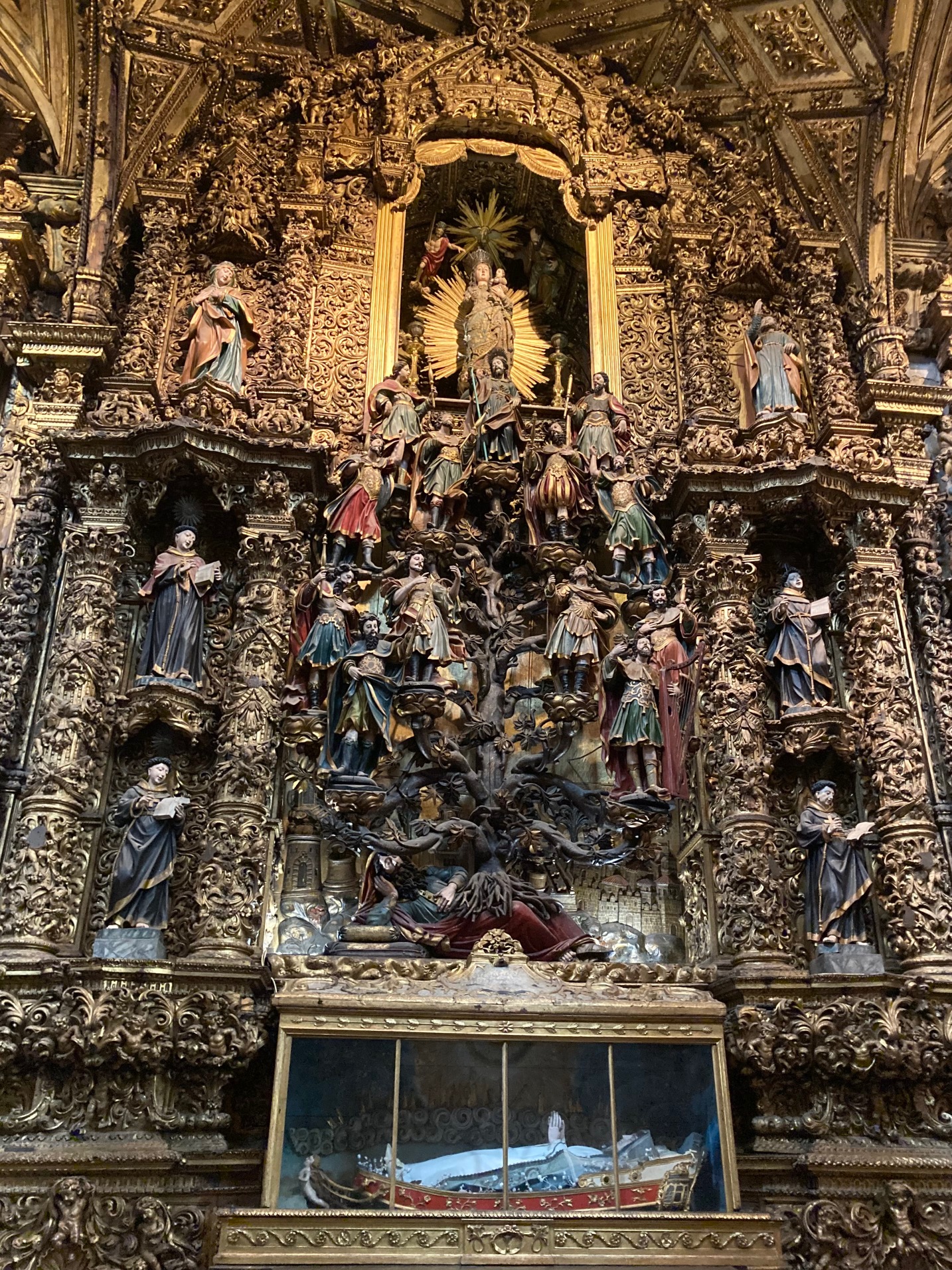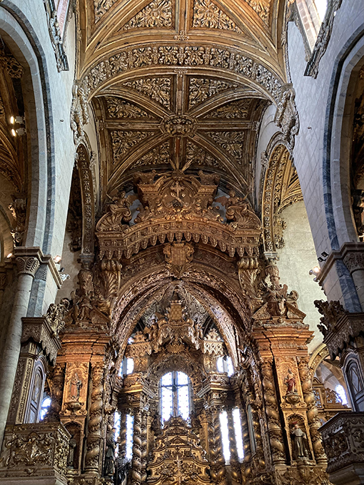 Ah, les églises… Bien sûr, on les a presque toutes visitées. Pour la plupart, elles datent du XVIIIe siècle mais ce n’est qu’au début XXe, que ces dames se sont parées de bleu ! Certaines affichent un décor intérieur d’une richesse ostentatoire à faire pâlir Crésus. C’est le cas de la Igreja de Sao Francisco. Alors là, c’est le pompon. Bâtie par les frères Franciscains au début du XIIIe siècle, l’église est passée d’une construction conforme à celle de cet ordre mendiant à l’opulence la plus clinquante. On a été estomaquées par tant d’ornements et de sculptures toutes recouvertes d’or. Les mecs qui ont conçu le projet, ont oublié qu’ils œuvraient pour Dieu. À se demander ce qui leur est passé par la tête. Au cours de la première moitié du XVIIIe siècle, ils ont décoré et décoré et redécoré… Y’en a partout ! La plupart des surfaces intérieures, y compris les murs, les colonnes, le toit et les chapelles latérales ont été revêtus de « talha dourada » baroques, boiseries sculptées et recouvertes d’or. Il a fallu 500 kilos du métal précieux pour recouvrir le bordel. À tel point que même les autorités religieuses ont un temps fermé le lieu au culte tant il était éloigné des valeurs de pauvreté prônées par les Franciscains et était indécent un tel étalage de richesse alors que dehors la misère était crasse ! Mais on y est resté longtemps. En fond sonore, un chant religieux chanté par des femmes résonnait et nous berçait. Pour un peu, on se serait couchées sur un banc et endormies !