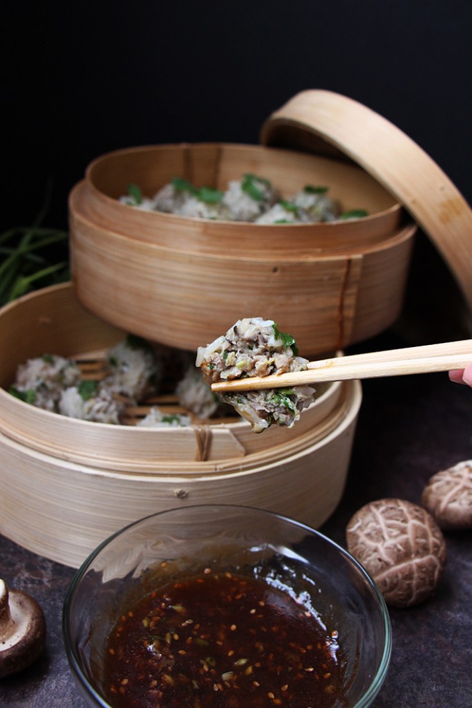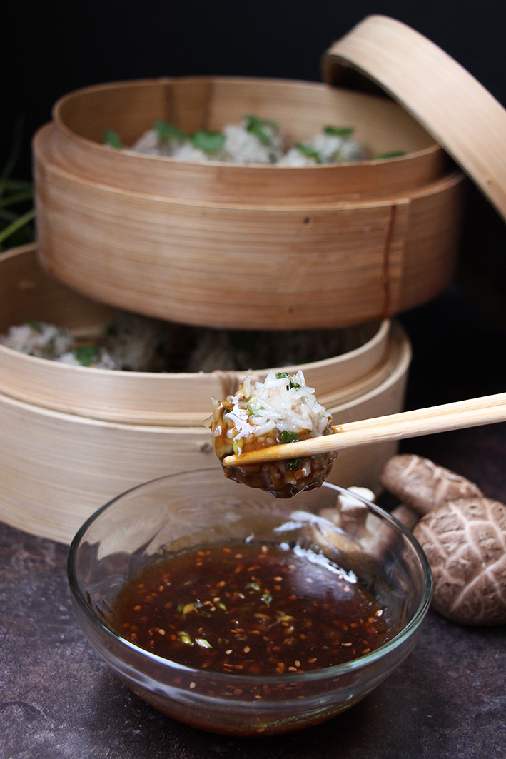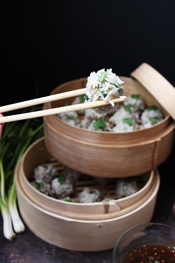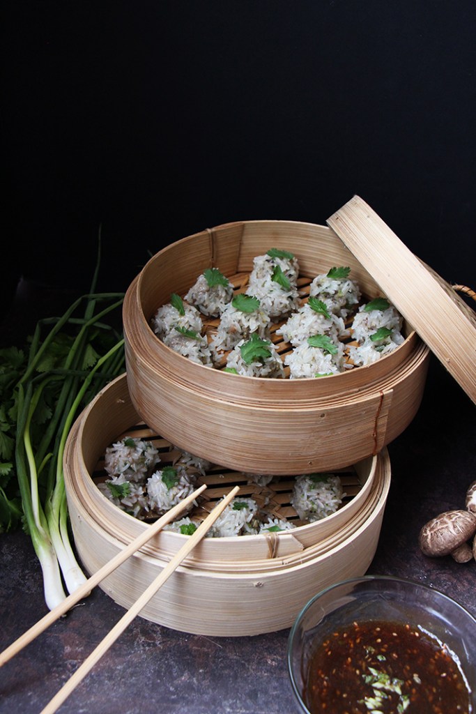 Réalisez des boulettes d’à peu près 3 cm de diamètre. Pour qu’elles aient toutes la même taille, on s’est servi d’une cuillère à mesure. Placez le riz gluant dans une assiette plate et roulez-y les boulettes. Tapissez votre panier vapeur de papier cuisson dans lequel vous aurez pris soin de faire des trous, placez-y vos boulettes et faites-les cuire pendant 15 minutes. Laissez un peu sécher vos boulettes à l’air libre avant de les servir. Le riz va se redresser un peu en séchant donnant à nos bouchées leurs crinières de lion ! Bah oui, sinon à quoi bon les appeler comme ça !