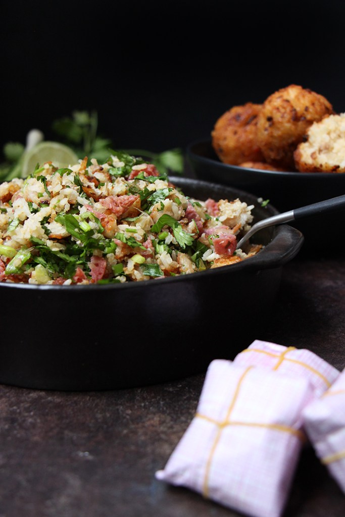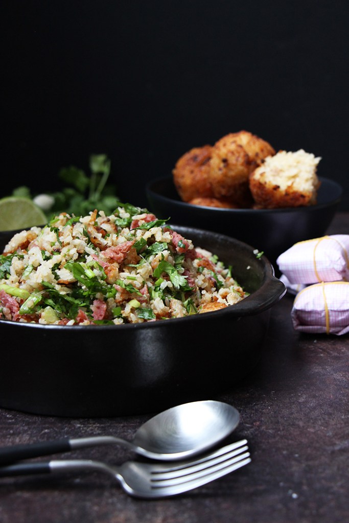Cette salade laotienne est tout bonnement une tuerie ! On l’adore ! Il faut bien le dire on se faisait une montagne de sa préparation. Déjà il y a le riz croustillant et qui dit croustillant dit friture. Qui dit friture dit odeurs, enfin, pas trop quand on utilise de l’huile spéciale. Et, qui dit huile dit pénurie ! Ouais, bientôt frites, pâtes et sauce à la moutarde vont devenir des mets de luxe ! Il paraît que les tomates en boîtes italiennes, type Mutti, sont aussi en péril tant le manque de contenants est grand et hors de prix. C’est la crise en Italie, ma bonne Lucette. L’inquiétude grandit ! Mais revenons à nos moutons car cette recette est laotienne et ne contient pas de tomate ! Donc, voilà, on faisait grand cas de ce riz croustillant, et surtout du som mou, ingrédient mystérieux pour les profanes que nous sommes. Mais si vous savez, ces petits paquets roses qui pendouillent, dans les épiceries asiatiques, vers le coin des saucisses et qui intriguent autant qu’ils repoussent à l’énoncé de leur intitulé : Porc fermenté ! Oups, ben oui, il faut oser. Bref on s’est lancées, et la salade était délicieuse ! Aussi bonne que celle qu’on avait pu déguster dans les quelques restos thaïs ou laotiens qui la servent. Si vous trouvez l’utilisation du som mou trop aventureuse, bonne nouvelle, vous pouvez faire la recette sans. On entend déjà les « Ouf » de soulagement, mais on vous l’assure, c’est bon. C’est un peu comme si vous faisiez un hachis de jambon très citronné et pimenté. Finalement on était assez fières de nous, et nos amis, qui étaient invités à dîner, se sont volontiers resservis ! Puisqu’on vous le dit que cette salade est à tomber. Rien que les boulettes de riz et coco… Miam miam ! Alors, osez, découvrez, cuisinez, partagez, dévorez !
