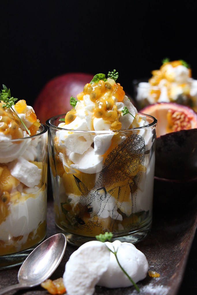Il ne reste plus qu’à monter les verrines. Déposez la préparation à la mangue au fond des verrines. Ajoutez les petites meringues. Couvrez de crème chantilly. Refaites l’opération. Pochez joliment la chantilly pour le top. Déposez un peu de pulpe de fruit de la passion du dernier fruit, quelques feuilles de basilic. Dévorez !