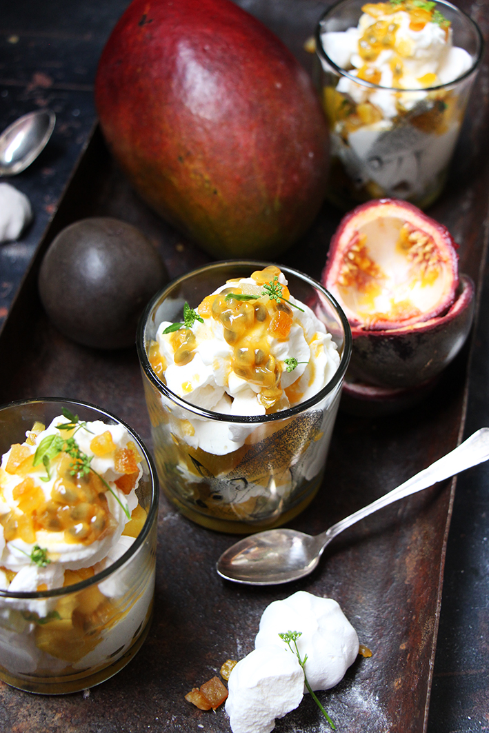 Il ne reste plus qu’à monter les verrines. Déposez la préparation à la mangue au fond des verrines. Ajoutez les petites meringues. Couvrez de crème chantilly. Refaites l’opération. Pochez joliment la chantilly pour le top. Déposez un peu de pulpe de fruit de la passion du dernier fruit, quelques feuilles de basilic. Dévorez !
