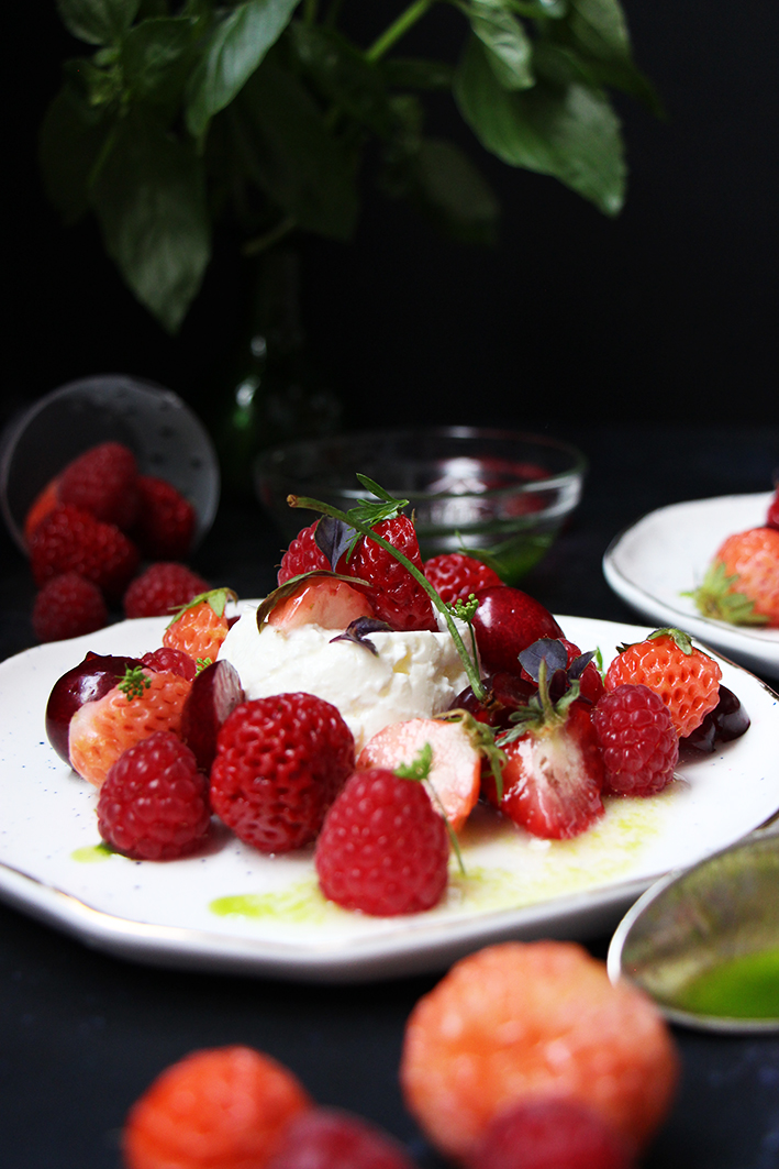 Dressez les faisselles dans de jolies assiettes. Disposez les fruits tout autour. Décorez de quelques feuilles de basilic frais. Arrosez généreusement de sirop de basilic. Dévorez !
