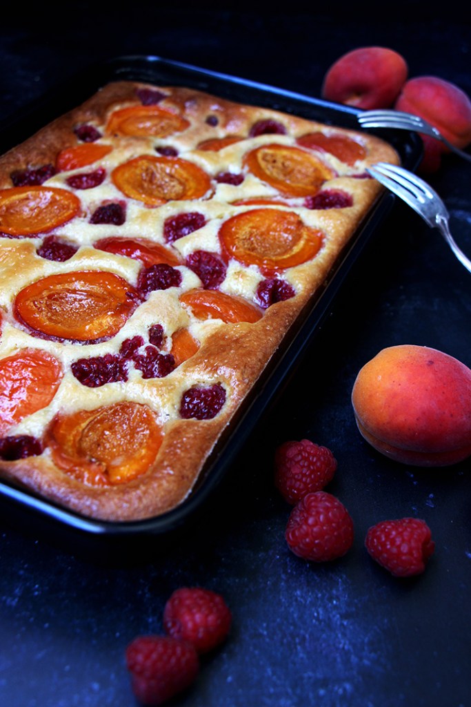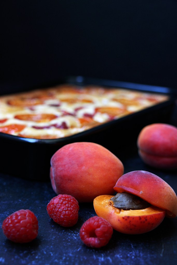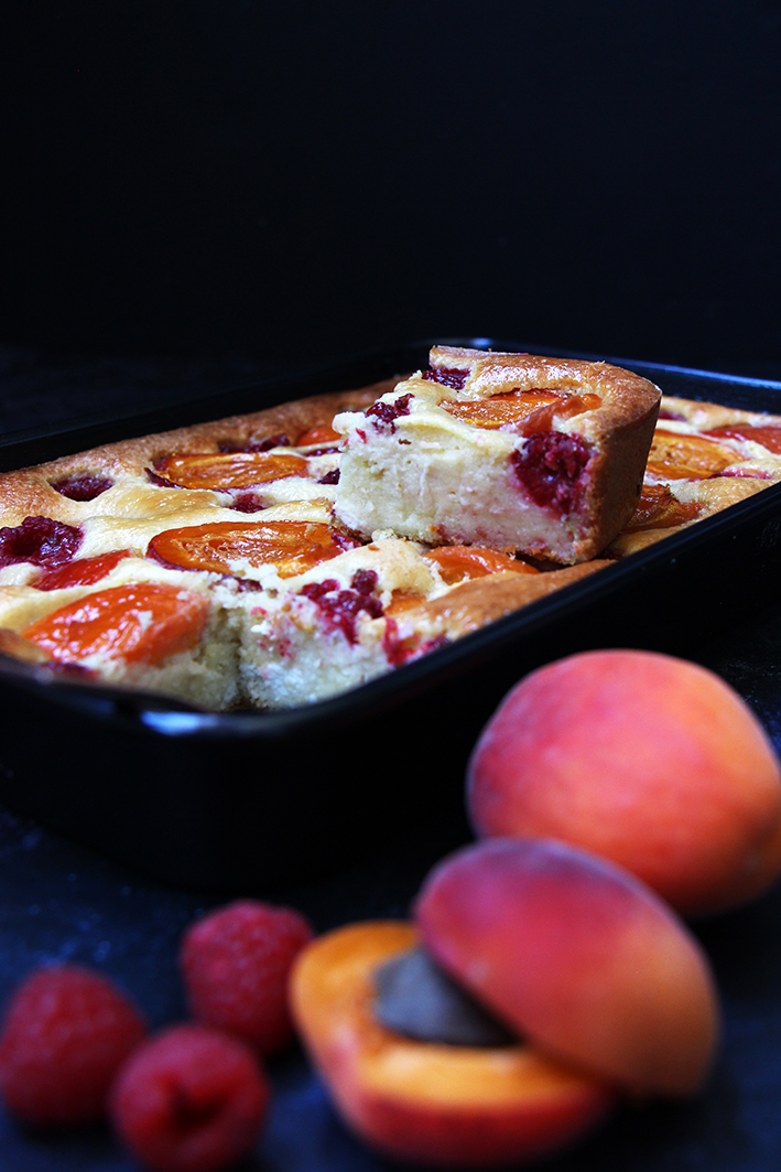 Disposez les abricots coupés en deux ou en 4, et les framboises. N’hésitez pas à les enfoncer parce que contrairement à d’autres gâteaux, les fruits ne couleront pas dans le fond du plat. Saupoudrez d’un peu de sucre. Enfournez pour 45-55 minutes selon les fours. Laissez refroidir le gâteau avant de le démouler. Dévorez…