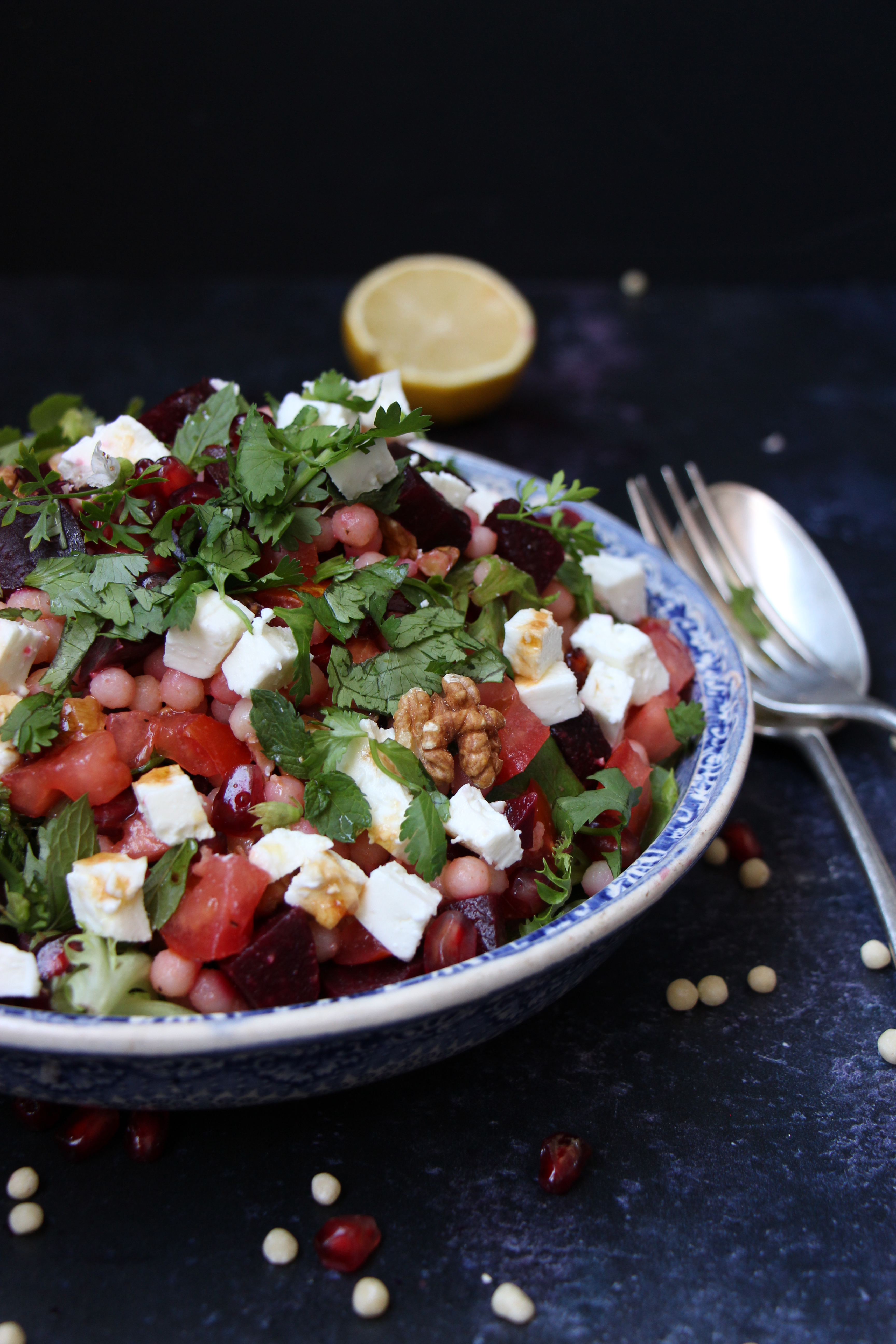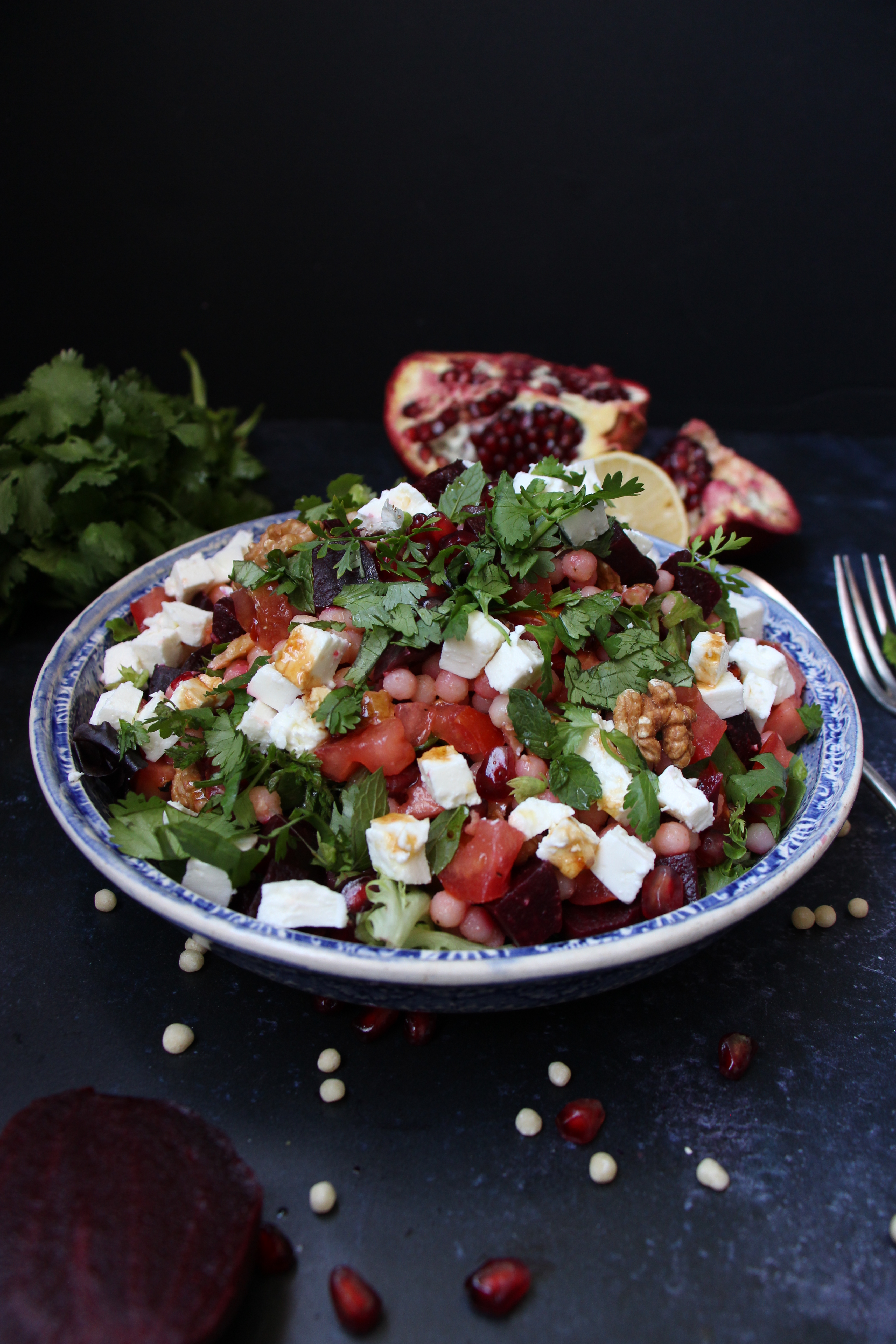 Faites la sauce en mélangeant tous les ingrédients et salez et poivrez selon votre goût. Dans le saladier contenant le moghrabieh, ajoutez quelques feuilles de mesclun, la tomate coupée en dés et les herbes fraîches. Mélangez. Sur un joli plat, déposez le reste du mesclun, une partie des betteraves coupées, puis ajoutez le mélange mogrhrabieh, tomate et herbes. Ajoutez le reste des betteraves coupées et la feta émiettée. Parsemer de graines de grenade, des noix hachées et des graines de cumin, quelques feuilles de coriandre. Ajoutez la sauce. Dévorez !