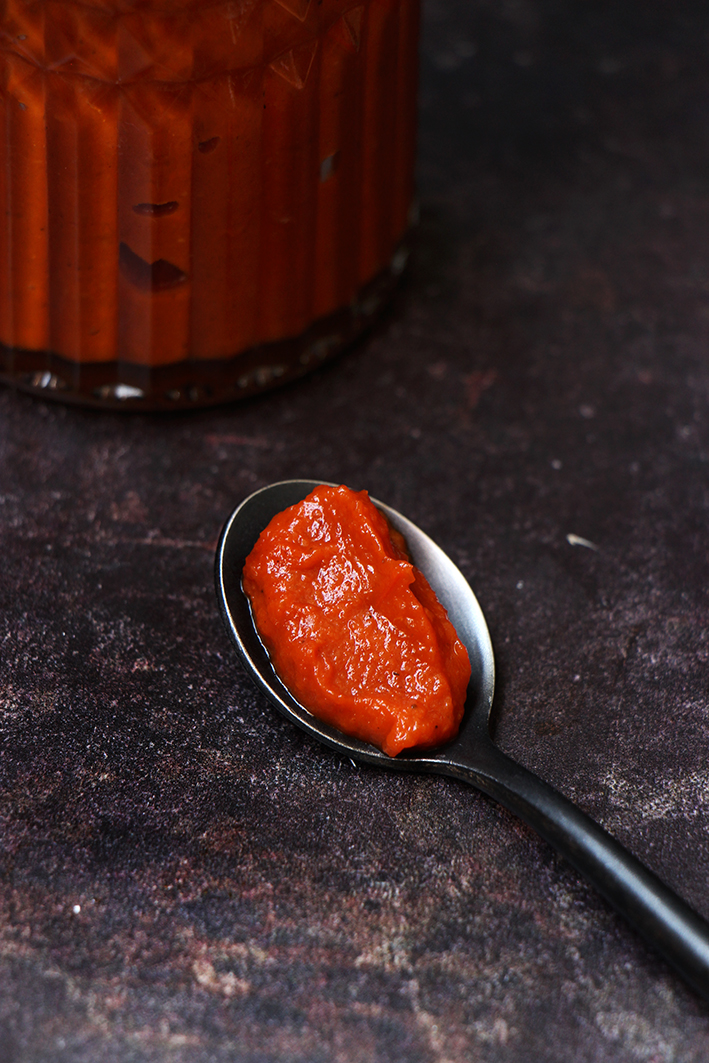 Transvasez la préparation dans un récipient à bord hauts et mixez au mixer plongeant jusqu’à obtenir une consistance lisse. Si la préparation est trop liquide, remettez dans le wok ou la sauteuse et, toujours à cause des projections tomatées, sans cesser de remuer, desséchez votre ketchup, une dizaine de minutes supplémentaires, jusqu’à obtenir une purée. Laissez complètement refroidir. En refroidissant le ketchup va devenir un peu plus épais. Transvasez-le dans une petite bouteille ou un bocal en verre. Dévorez !