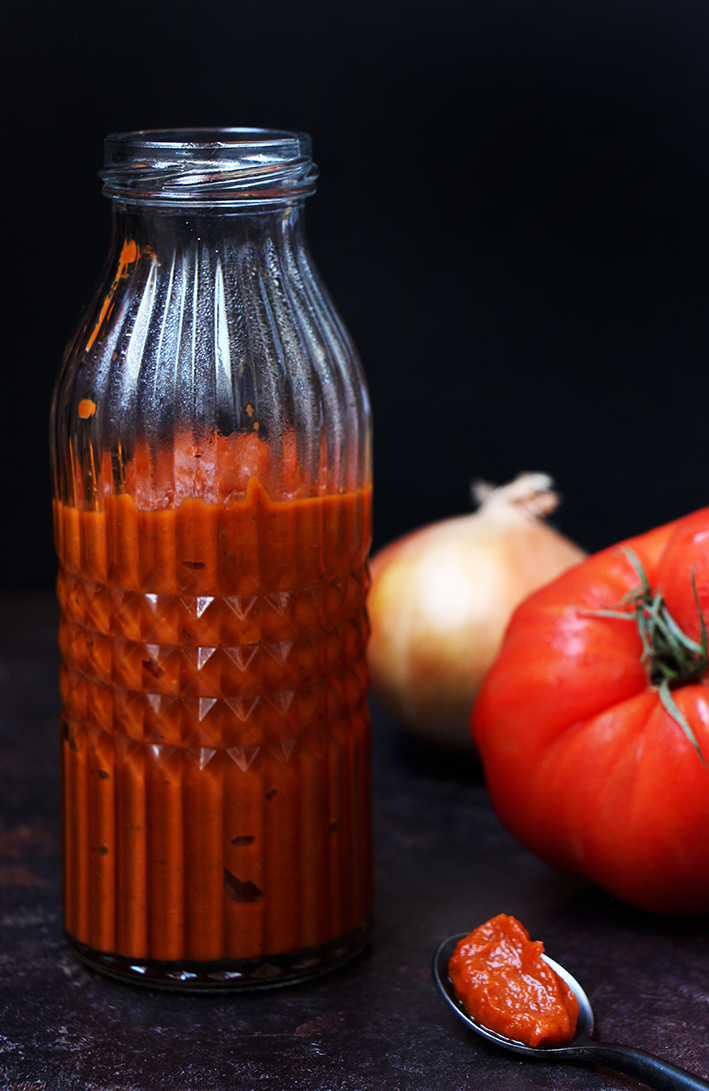 C’est l’occasion qui fait le larron et la recette ! Ce Week-end on est allées chez nos amis, Cécile et Damien, en Normandie. Sur le marché de la jolie ville de Bernay, on a trouvé des énormes tomates cœur de bœuf, françaises, à moins de 2 euros le kilo ! Bah, elles ont fini dans notre panier ! On en a fait certaines au barbecue et les autres sont revenues avec nous à paris. Bon, on avait un dîner de prévu et elles auraient dû finir en salade avec de la burrata, mais finalement le repas s’est déplacé chez les amis qu’on devait recevoir. Et comme on ne va pas manger deux kilos de tomates, l’une des grosses mémères rouges, oui, il y en a des jaunes aussi, à fini en beauté, en ketchup ! Hummm, il ne manque plus que les frites ! Profitez de la saison de ces belles, cuisinez, partagez, profitez de vos vacances, dévorez !