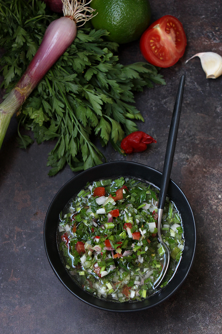 La caravane passe, le chien aboie et il finit en sauce ! Ahaha ça pourrait être une histoire vraie, faite des aventures rocambolesques de pionniers perdus dans une contrée inhospitalière et qui, faute de nourriture, seraient obligés de chasser et de bouffer les dingos qui peuplent ces plaines arides. La viande forte en goût, n’est mangeable qu’agrémentée d’une sauce faite d’herbes sauvages et de quelques piments et oignons glanés çà et là. Oui, oui, on a l’imagination fertile mais la sauce chien, qui nous vient des Antilles, tient son nom de la marque du couteau utilisé pour la faire ! On est très sauce en ce moment… C’est l’effet vacances. On farniente et puis on agrémente les barbecues que l’on ne fait pas, puisqu’on est à Paris. En tout cas si vous vous êtes en vacances, ou pas, cette sauce est délicieuse et se marie avec tout. Alors cuisinez, partagez, dévorez !