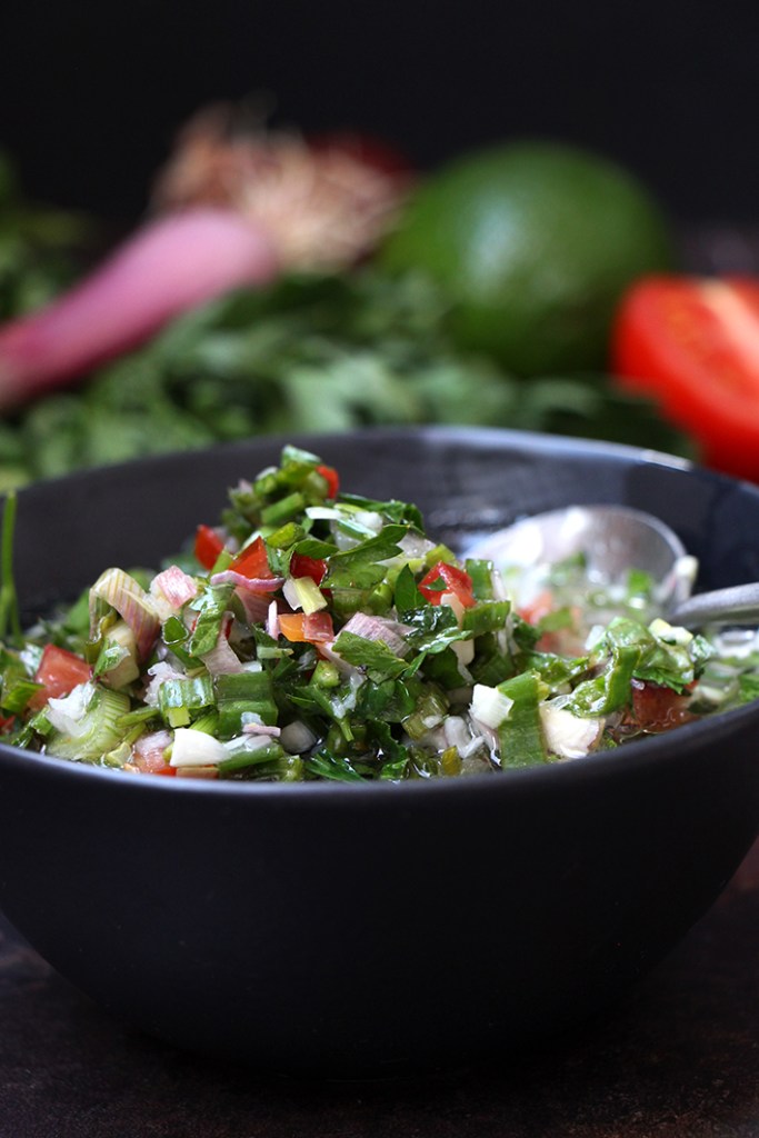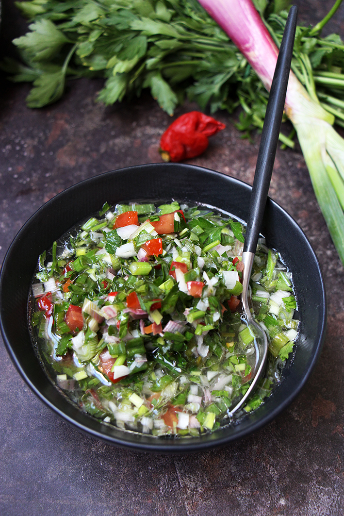 Mettez le tout dans un petit saladier. Salez et poivrez et ajoutez une pincée de piment fort, en poudre, si vous le souhaitez. Ajoutez le jus du citron vert, l’huile et l’eau frémissante, (pas bouillante, sinon vos ingrédients verts vont devenir marron).