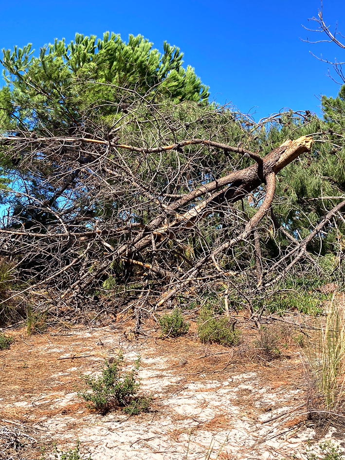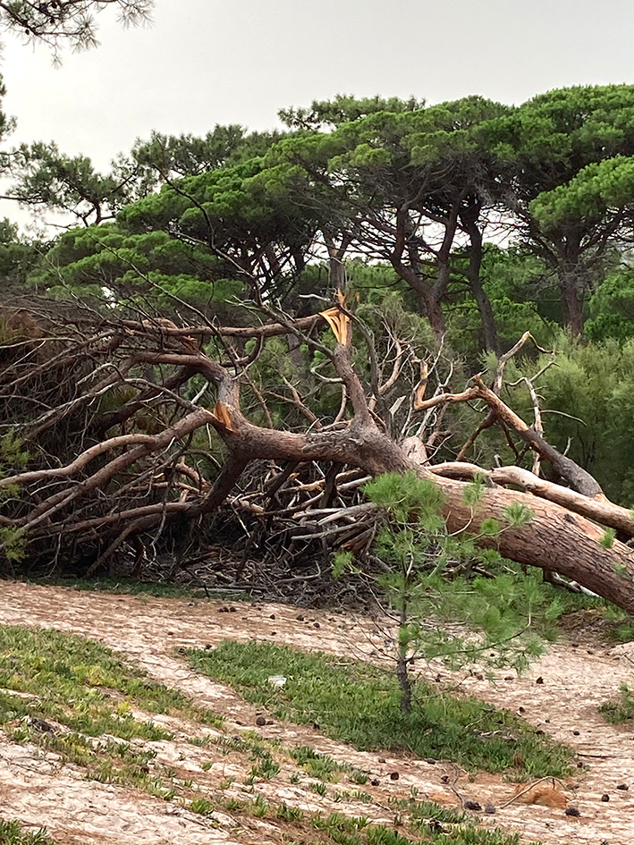 La première chose qui nous a marquée en descendant du taxi, c’est cet accès barré à la forêt, derrière la résidence. La tempête d’août avait laissé l’empreinte de son passage dévastateur. Beaucoup de grands eucalyptus et de pins étaient tombés, renversés par le vent furieux, comme de vulgaires fétus de paille, ou bien avaient perdu des branches. À certains endroits, les tronçonneuses avaient dégagé, à la hâte, les troncs couchés, dévoilant ici, le cœur rouge des eucalyptus et libérant, là, l’odeur de la sève des pins. Quel triste spectacle. Parfois, lorsque nous traversions la pinède pour nous rendre à la plage et que le vent soufflait, nous nous hâtions, inquiètes, en regardant les arbres s’agiter au-dessus de nos têtes.
