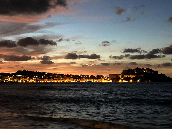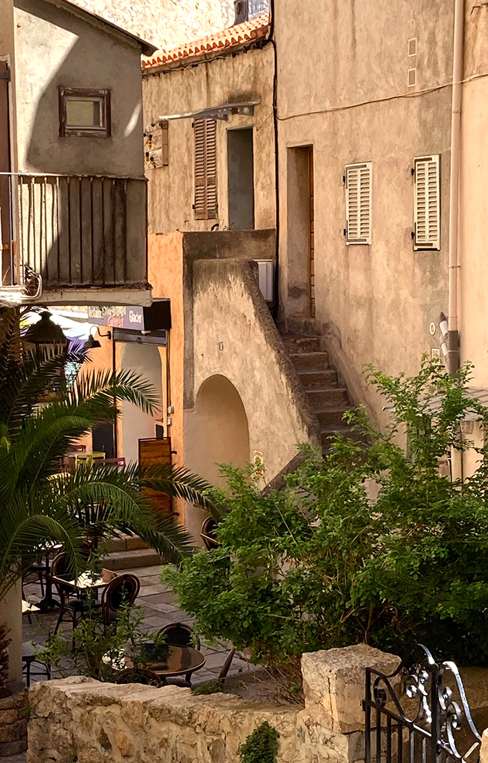 Bien sûr, on a visité Calvi, plusieurs fois. Empruntant, la jolie passerelle en bois qui longe la côte, la voie ferrée et la pinède – toujours elle – on a marché jusqu’à la ville ! Oui, on a tout fait à pied ou en petit train. Calvi est belle lovée sous les remparts de la majestueuse citadelle génoise. On a arpenté ses ruelles étroites. Sainte Lucie, nous a présenté ses yeux, dans l’église toute de rose vêtue de sainte Marie Majeure. Une histoire de fiancé trop empressé de la marier, obnubilé par la beauté de ses yeux. Elle, vouée toute entière aux nécessiteux, se les serait arrachés puis les aurait portés sur un plateau à l’entreprenant jeune homme, pour qu’il lui foute la paix… Gloups ! Heureusement la Sainte Vierge, devant tant d’abnégation dans la foi, aurait par la suite rendu la vue à Lucie, avec des yeux plus beaux encore… ouf ! On a fait une halte chez Annie traiteur, une institution gourmande, pour faire le plein de charcuteries, de confitures et de fromages, et mangé une glace aux herbes du maquis et à la brousse chez A Scola. On a fait notre pèlerinage jusqu’à Notre Dame de la Serra, mais comme un malheur n’arrive jamais seul, la foudre avait décapité la Vierge, le 2 septembre dernier… Re-gloups !