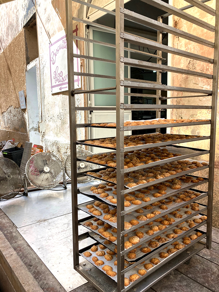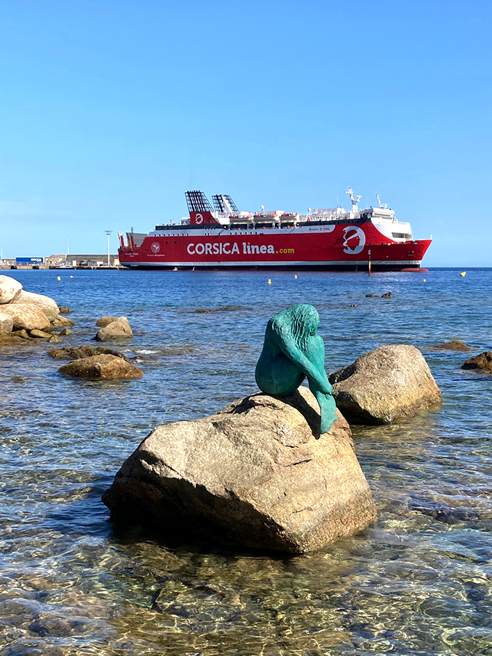 On s’est baignées encore et encore, puis, un matin, on a pris le petit train, plutôt une bétaillère tant on était nombreux, pour aller à l’île Rousse. La petite Sirène, tête dans les genoux, pleurait sans doute la pollution engendrée par les gros ferries à quai. La mer était plus translucide encore qu’à Calvi et le sable, de la plage Napoléon, d’un blanc immaculé, mais on ne s’est pas baignées. Non, on avait pris nos maillots pourtant, mais le marché a eu raison de nos velléités de baignade. Suivant lentement la cohorte des touristes et des gens du coin, piétinant devant les stands, j’ai repéré sur un stand du filet mignon séché. Sandrine saoulée par le monde n’y avait pas prêté attention. Moi si ! Marie-Ange, petite femme aux cheveux platine et à la mèche rose, a ses habitués venus pour la gorge de porc, ses saucisses et saucissons. On est reparties les bras chargés de lonzu, de coppa et de bien sûr de filet mignon. Marie-Ange, qui soigne ses clients, nous a offert du fitone, sorte de figatellu fine. On n’est pas très fan mais un cadeau ça ne se refuse pas. On a réfléchi, puis on est revenu acheter plus de charcuterie et Marie-Ange nous a offert un pot de tapenade. Ne la cherchez pas d’octobre à juin, elle sera au Sénégal pour des vacances bien méritées. On a arpenté les rues de la ville aux hautes façades beige rosé et aux volets bleus et fait une halte à la biscuiterie Salvatori, située sur la place du canon, ombragée par un immense caoutchouc. On a acheté des canistrelli et des tourtellini et le monsieur a gentiment jeté nos canettes de limonade, car en ville il n’y a pas de poubelle ! Et oui, les poubelles, ça fait des saletés en ville… Pas de poubelle aussi ! On a continué notre chemin sous un soleil de plomb, pris une Pietra au bar de platanes, piazza Paoli, et puis on reprit le petit train, qu’on a bien failli rater d’ailleurs.