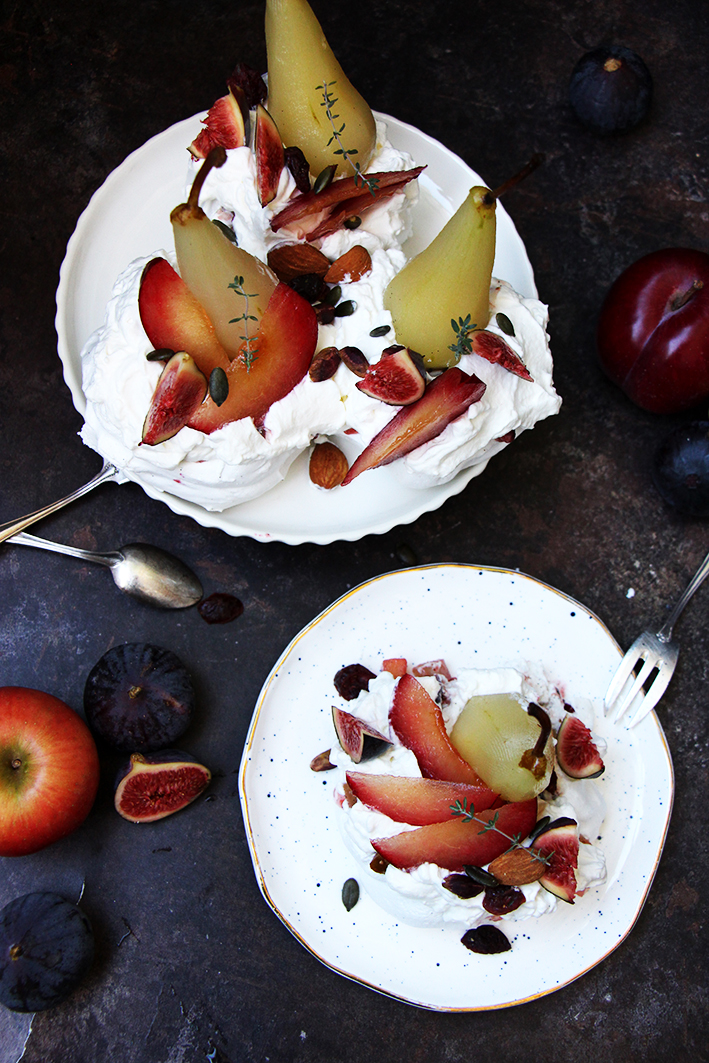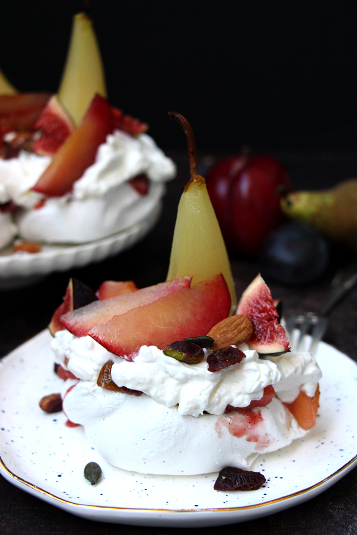 Pour chaque meringue, déposez une belle cuillère de compotée de fruits. Pochez la chantilly par-dessus, à l’aide d’une douille ou d’une cuillère, pour masquer les fruits. Essuyez les poires pochées avec un sopalin, et déposez-les sur la chantilly. Attention à l’équilibre ! Décorez de tranches de prunes, de figue et parsemez des fruits secs. Vite, il est temps de déguster, sinon, la meringue risque de se détremper… Dévorez !