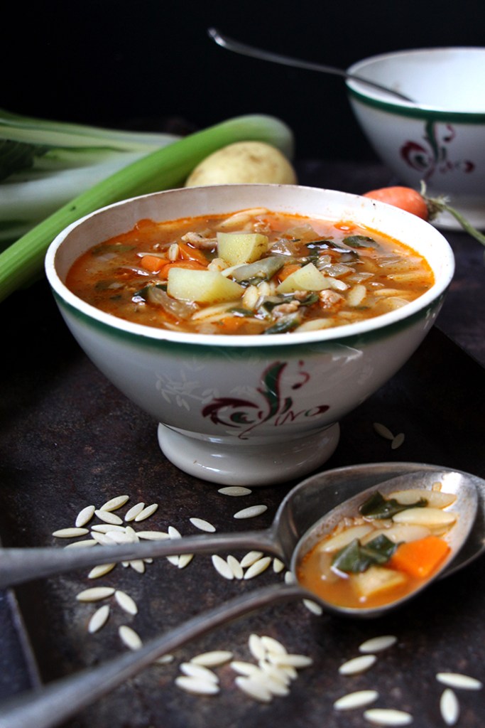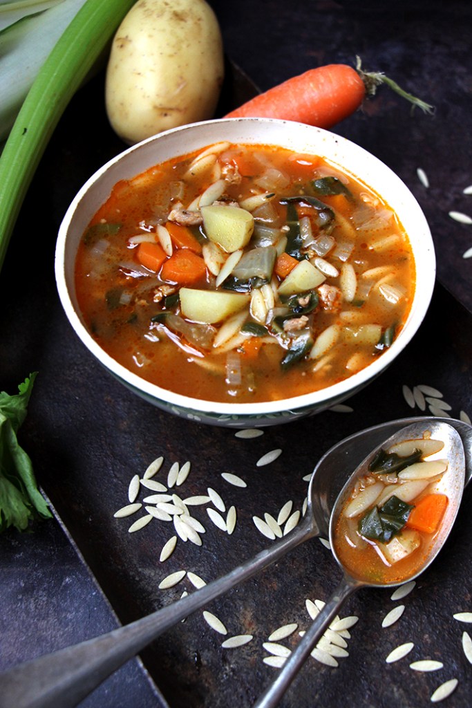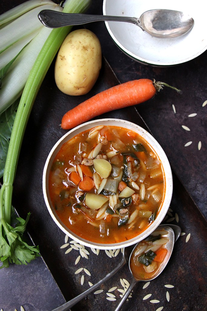 Lavez épluchez et coupez tous les légumes en macédoine (petits cubes). Coupez finement les blettes et le céleri, feuilles et branches comprises. Dans une cocotte à feu moyen, faites cuire la saucisse sans la peau dans un filet d’huile d’olive. Émiettez-la grossièrement.